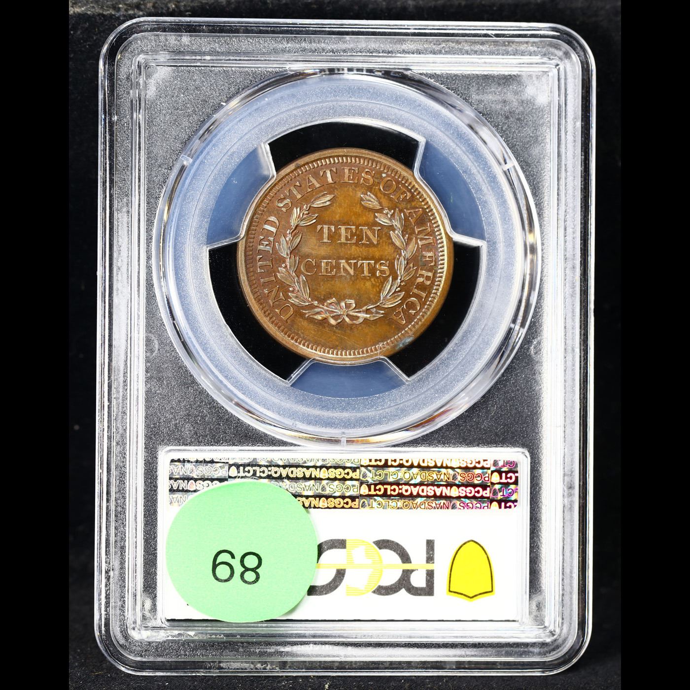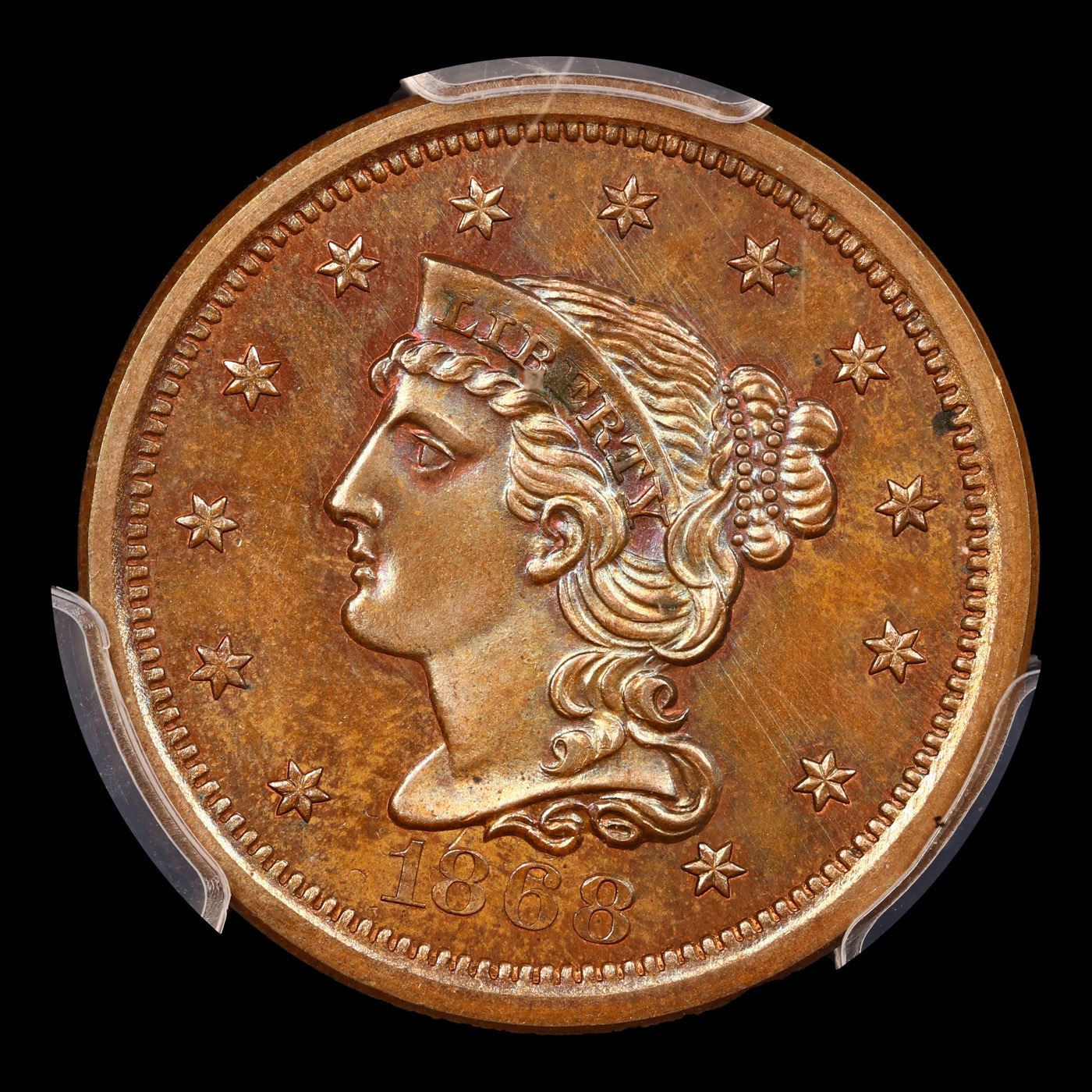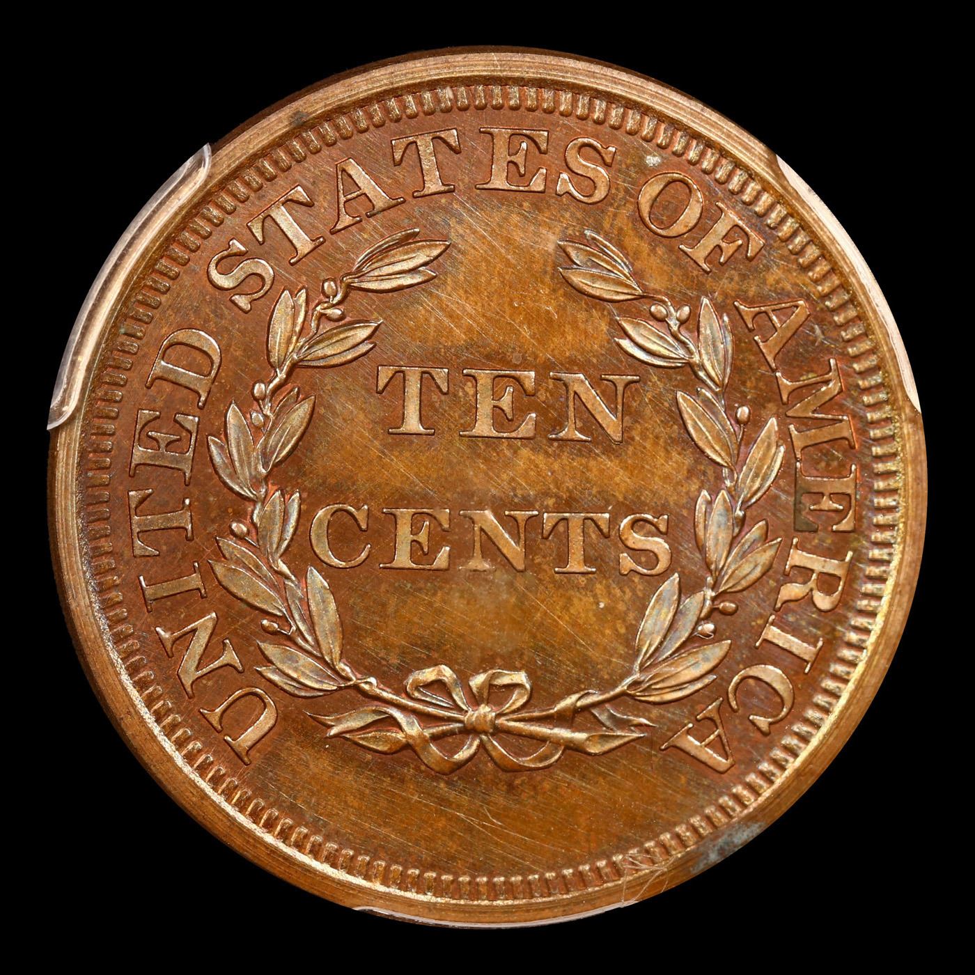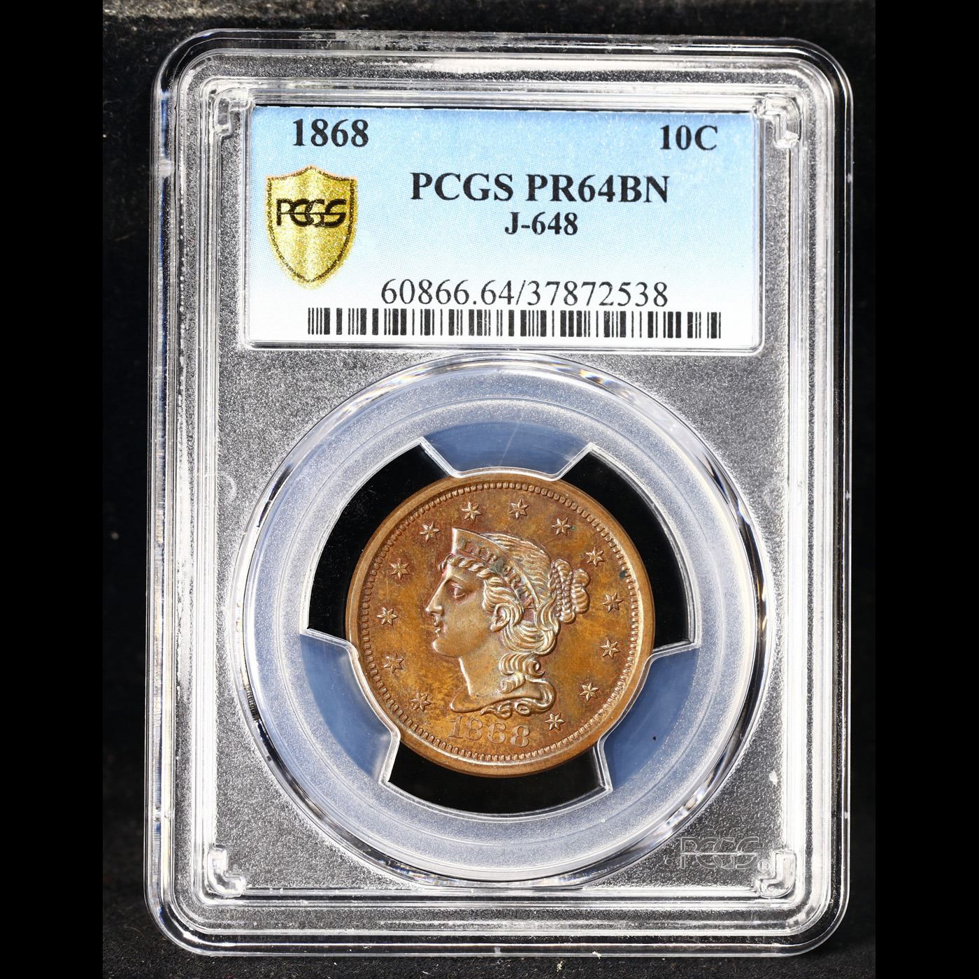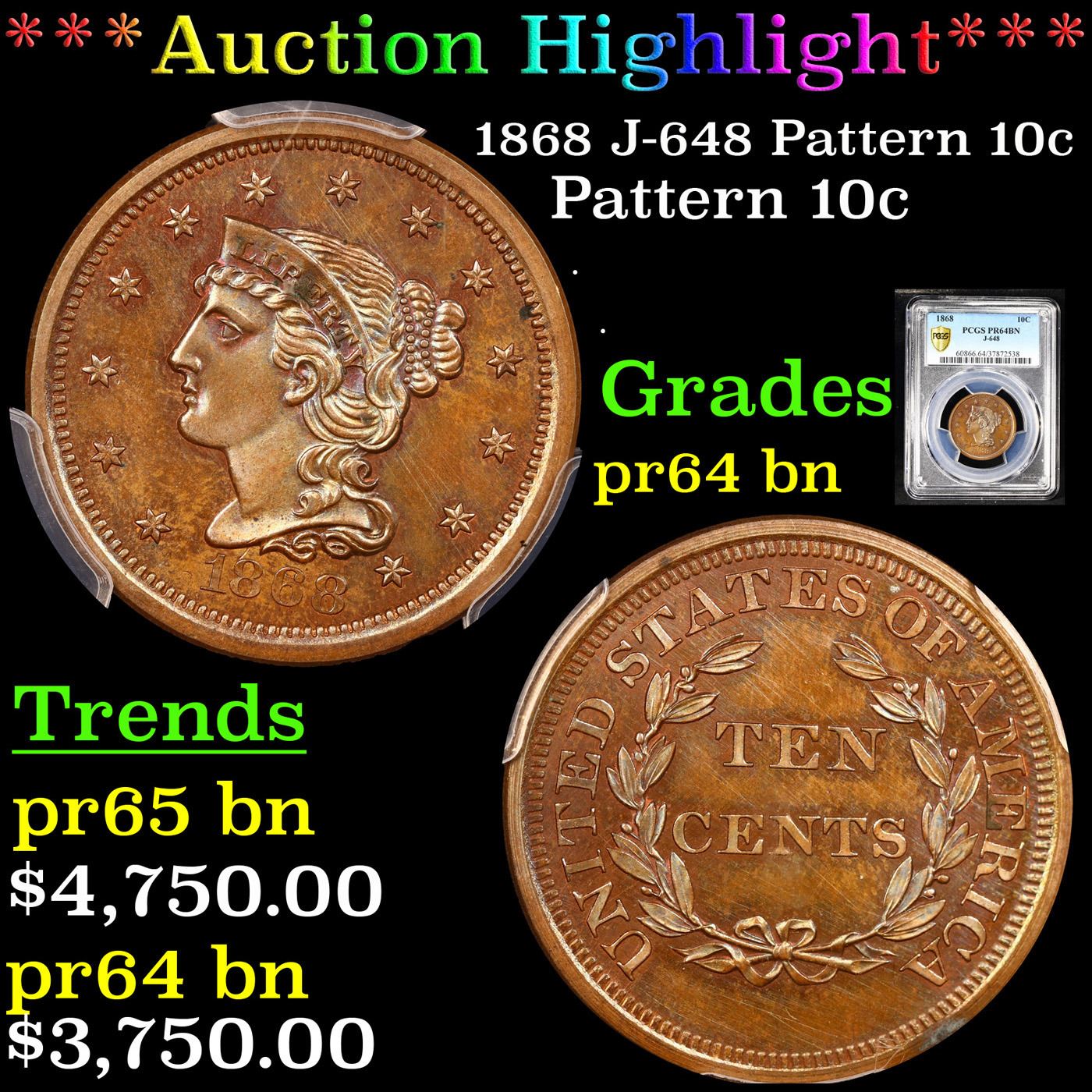 ***Auction Highlight*** PCGS 1868 J-648 Pattern 10c Graded pr64 bn By PCGS. Pattern coin - 1868 10C Ten Cents, Judd-648, Pollock-721, High R.6, PR64 Brown PCGS. The obverse features the nearly identical design used on large cents from 1843 to 1857. Although the reverse is similar to the large cent design, the wreath is smaller and open, and TEN CENTS is in the center. Struck in copper with a plain edge. Examples were struck in both copper and nickel, each has a survivorship estimated around two dozen pieces. Each side has mellowed to a light jade-green and pale blue patina with faint traces of cherry-red around and within the recesses of the devices. Note the last pr64 bn to sell, sold in september of 2021 for $4800.