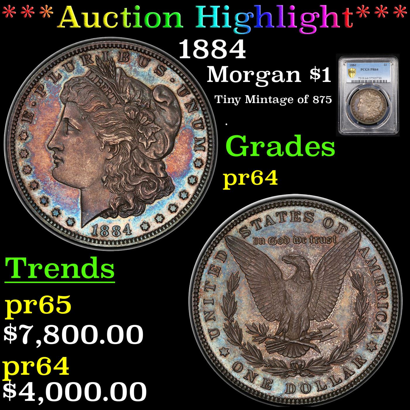 ***Auction Highlight*** PCGS 1884 Morgan Dollar $1 Graded pr64 By PCGS. 1884 Morgan Dollar PR64 PCGS. Richly toned in a blend of variegated copper and sandy-gray shades, this handsome specimen reveals more vivid blue, gold, lilac and apricot undertones as the surfaces dip into a light. Razor sharp in striking detail with carefully preserved surfaces, there is much to recommend this conditionally rare Gem to advanced specimen type and date collectors. From a mintage of 875 Proofs A Corey's Pick, Bid to Win, Don't let it get Away, you might not find its equal Coin. I give this coin my highest recommendation