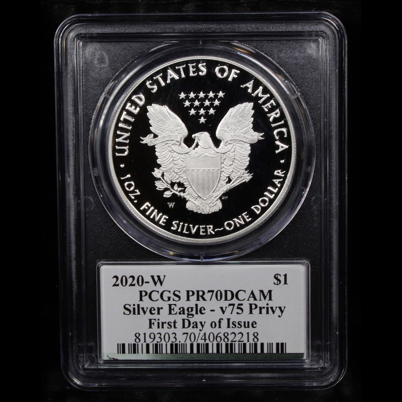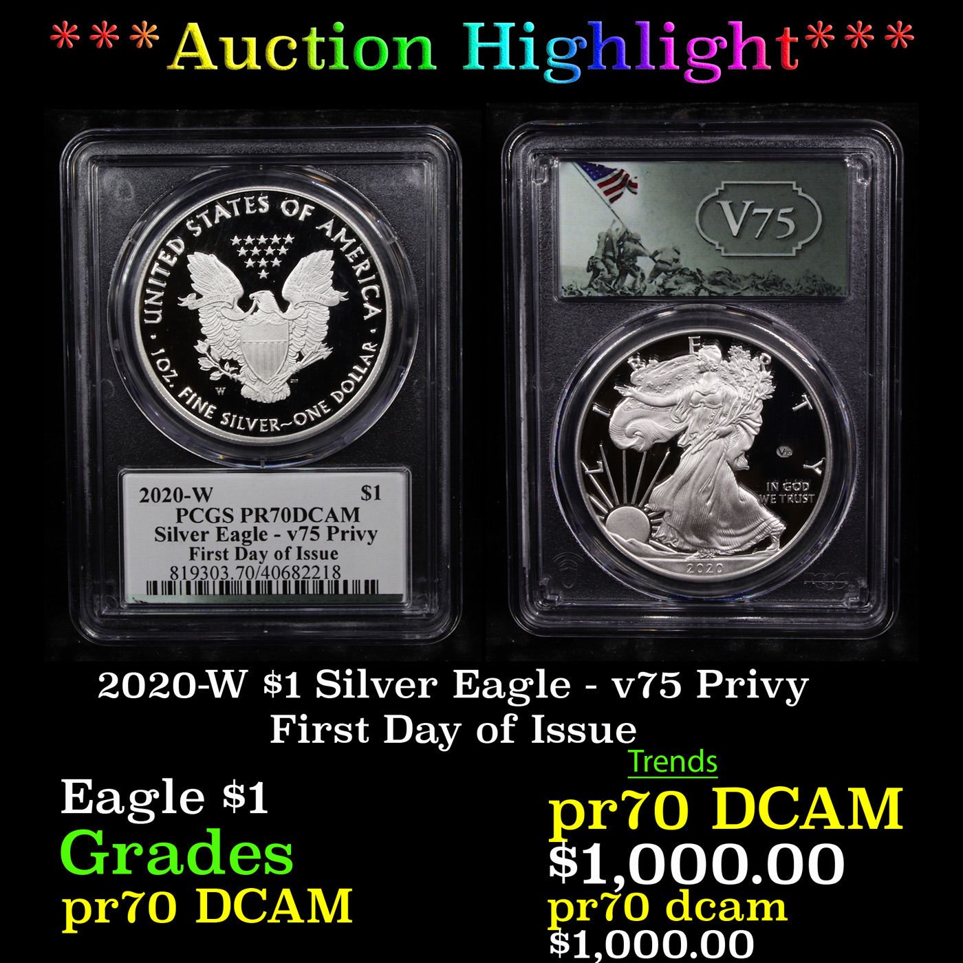 ***Auction Highlight*** PCGS 2020-W $1 Silver Eagle - v75 Privy First Day of Issue WWII 75th Anniversary Silver Eagle Dollar $1 pr70 DCAM By PCGS. The Mint did it again! They have just released the first and only ever Silver Eagle to be struck with a "privy mark!" The "V75" Privy mark has been stamped on the obverse of the coin to commemorate the 75th Anniversary of the ending of WWII. The shape of the privy mark represents the shape of the Rainbow Pool, which is an important part of the WWII Memorial. Only 75,000 of these Proof Silver Eagles have been minted, which makes it the 3rd lowest mintage Silver Eagle ever minted! The only comparable coins to this piece are the 1995-W and the 2019-S Enhanced Reverse Proof Silver Eagles which are worth $15,000+ and $3,000+ in perfect grade 70!