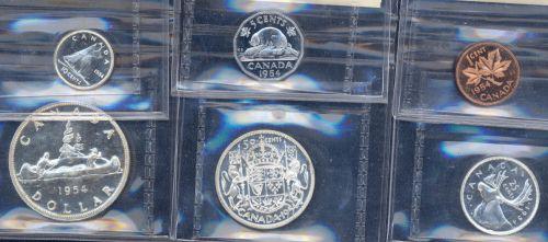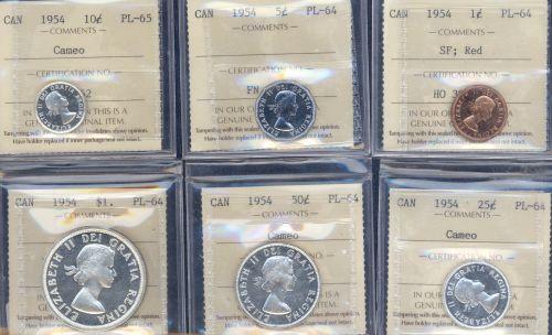 Proof Like Set 1954 all ICCS certified; 1 Cent SF PL-64 Red, Cameo not mentioned on holder, 5 Cents PL-64, 10 Cents PL-65 Cameo, 25 Cents PL-64 Cameo, 50 Cents PL-64 Cameo, Dollar PL-64 Cameo.