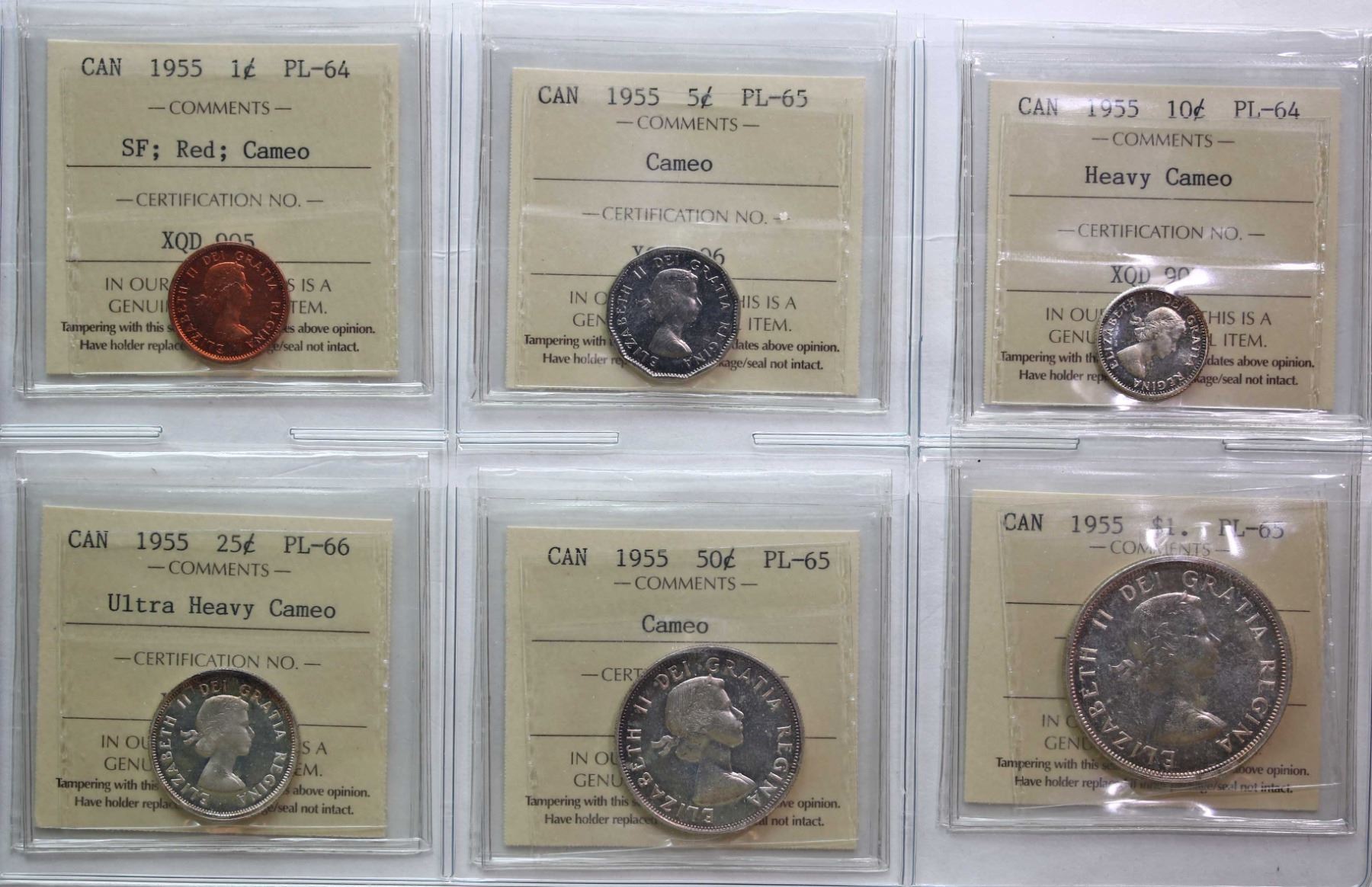 Proof-Like Set; 1955 "SF" PL Set. 1¢ is Red - Cameo, 5¢ Cameo, 10¢ Heavy Cameo, 25¢ Ultra Heavy Cameo, 50¢ Cameo- All 6 coins ICCS Choice Proof-Like-64 to Superb Gem Proof-Like-66. A superior and appealing set.