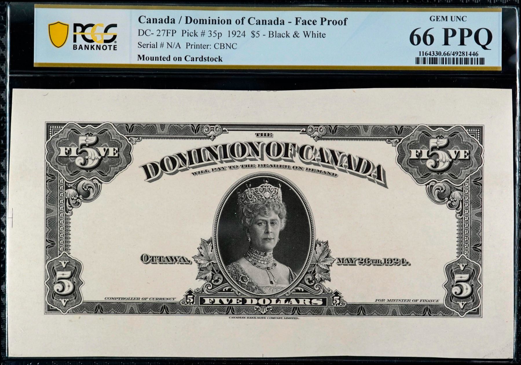 Proof Notes; 1924 $5 DC-27FP, PCGS Superb Gem Uncirculated-66PPQ. Black and White Face Proof example.