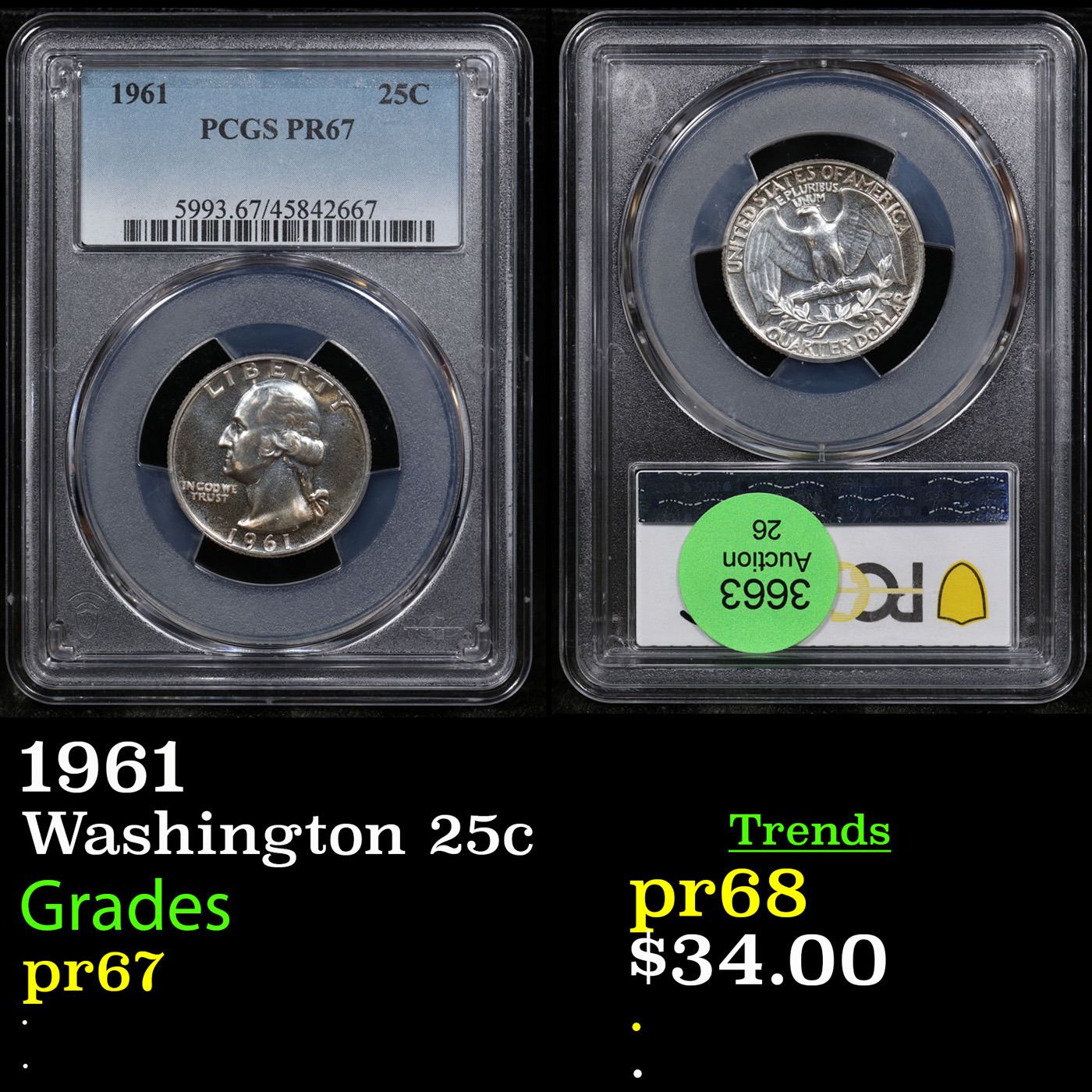 PCGS 1961 Washington Quarter 25c Graded pr67 By PCGS.