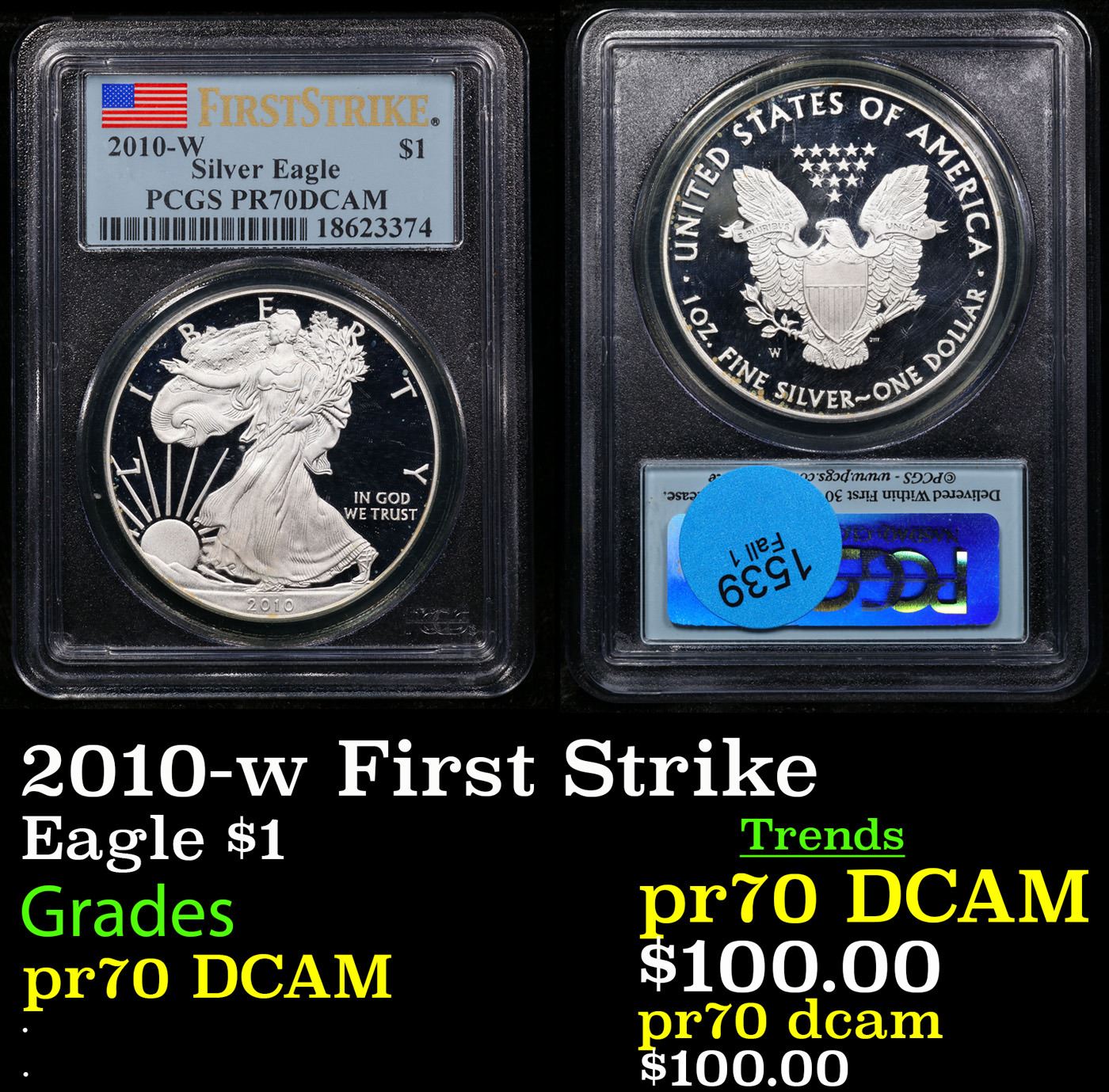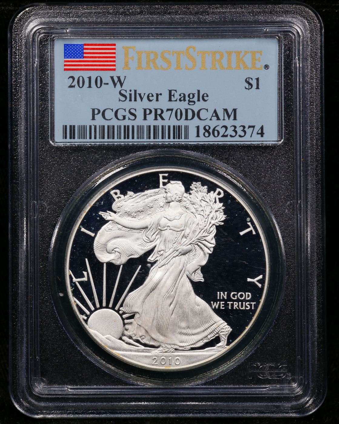 PCGS 2010-w First Strike Silver Eagle Dollar $1 Graded pr70 DCAM By PCGS. This coin qualify as "First Strike" by PCGS because it was made in the first 30 days of the Mint's Release.