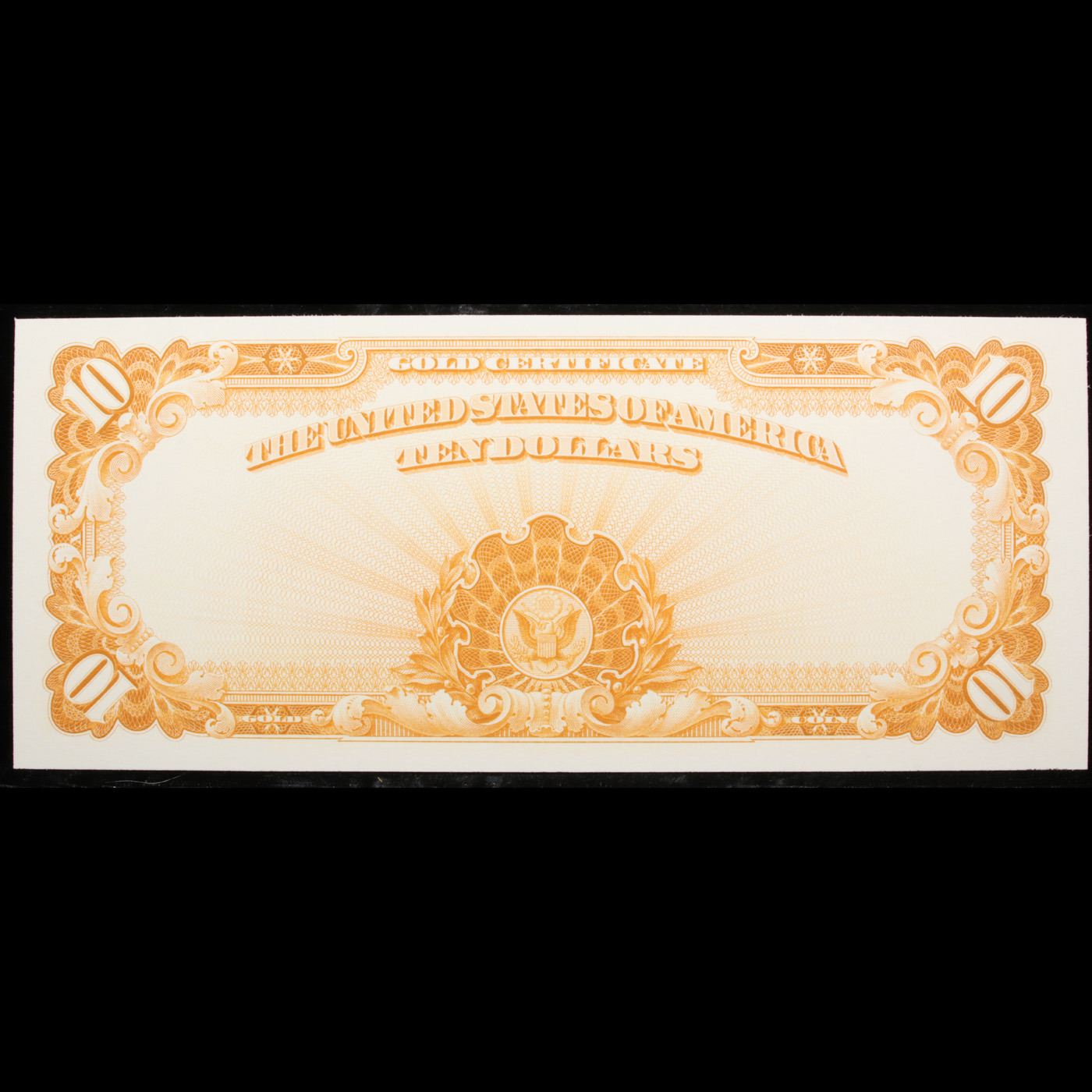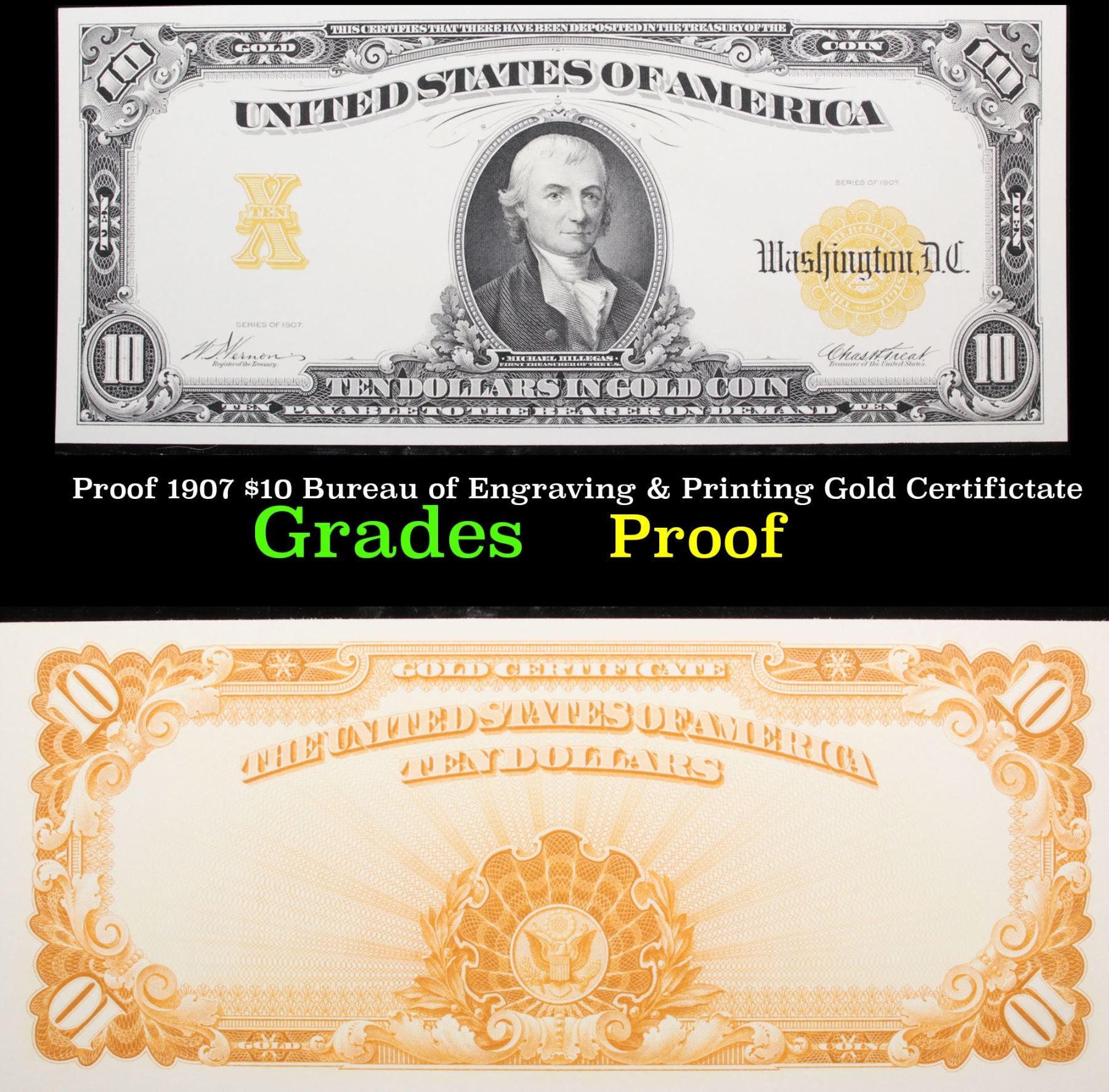 Proof 1907 $10 Bureau of Engraving & Printing Gold Certifictate Grades Proof. Up for auction is a Bureau of Engraving and Printing (BEP) Proof Print of the 1907 $10 Gold certificate. It is printed using the original Plates from the Bureau of Engraving and Printings archives. It was printed on two separate strikes, for the front and the back. It lacks serial numbers, but otherwise is a perfect proof of the Incredibly rare 1907 $10 Gold Certificate.