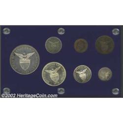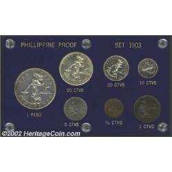 Proof Set 1903, KM-PS1, A scarce and popular set. The Peso exhibits considerable handling, while the remaining six coins are average for this issue. Housed in a custom plastic holder. 7 coins Important notice: We expect to be auctioning lots at the rate of 200-250 per hour. Sometimes eBay Premier live bid software cannot keep up with that pace, so we strongly recommend that you place a realistic proxy bid now as insurance to avoid disappointment. Also please note that all Heritage/CAA lots purchased through eBay Premier carry a 20% Buyer's Premium. Please make sure you read the Terms and Conditions.