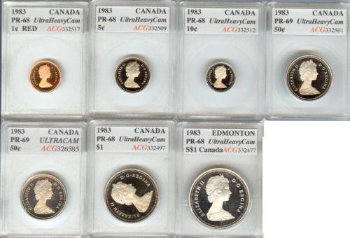 Proof Set 1983 all coins certified ACG; 1 Cent PR-68 Red Ultra Heavy Cameo, 5 cents PR-68 Ultra Heavy Cameo, 10 cents PR-68 Ultra Heavy Cameo Cameo, 50 Cents PR-69 Ultra Heavy Cameo Cameo, 50 Cents PR-69 Ultra Heavy Cameo & 1 Dollar PR-68 Ultra Heavy Cameo, 1 Dollar Edmonton Commemorative PR-68 Ultra Heavy Cameo. 25 cents replaced by a second 50 cents.