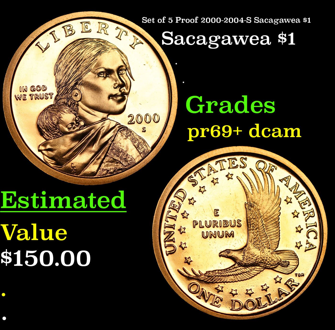 Proof Set of 5 Proof 2000-2004-S Sacagawea $1 Sacagawea Dollar $1 Grades GEM++ Proof Deep Cameo