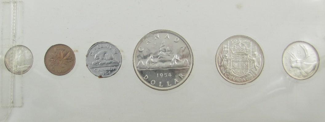 Proof-like set, 1954 SF, in card. An average set with brilliant coins. The cent is toned and the 5 cents has some rust.
