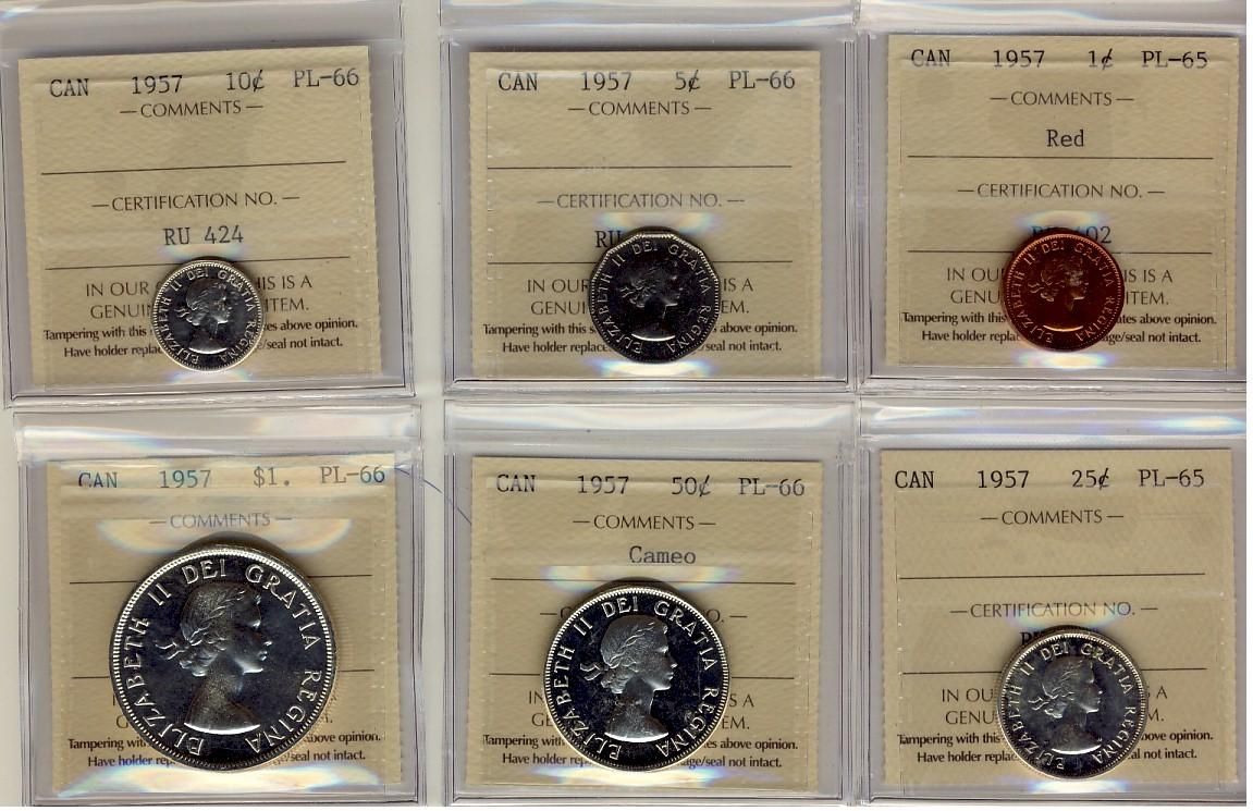 Proof-like set; 1957 1¢ and 25¢ ICCS PL65 5¢,10¢ 50¢ and $1. All ICCS PL66