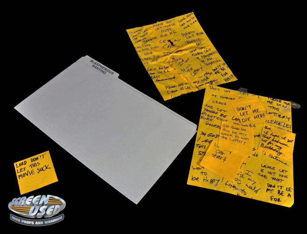 (Universal, 2003) This is a set of prop Post-it note prayers that were used as set dressing in Bruce's room when he tries to answer everyone's prayers. The set consists of two 8.5" x 11" photocopied pages that features several notes and several individual notes, some of the individual notes are stuck to the pages. This folder was one of several contained in God's filing cabinet and is blank on the inside. The folder measures 9" x 14" and is in very good condition.