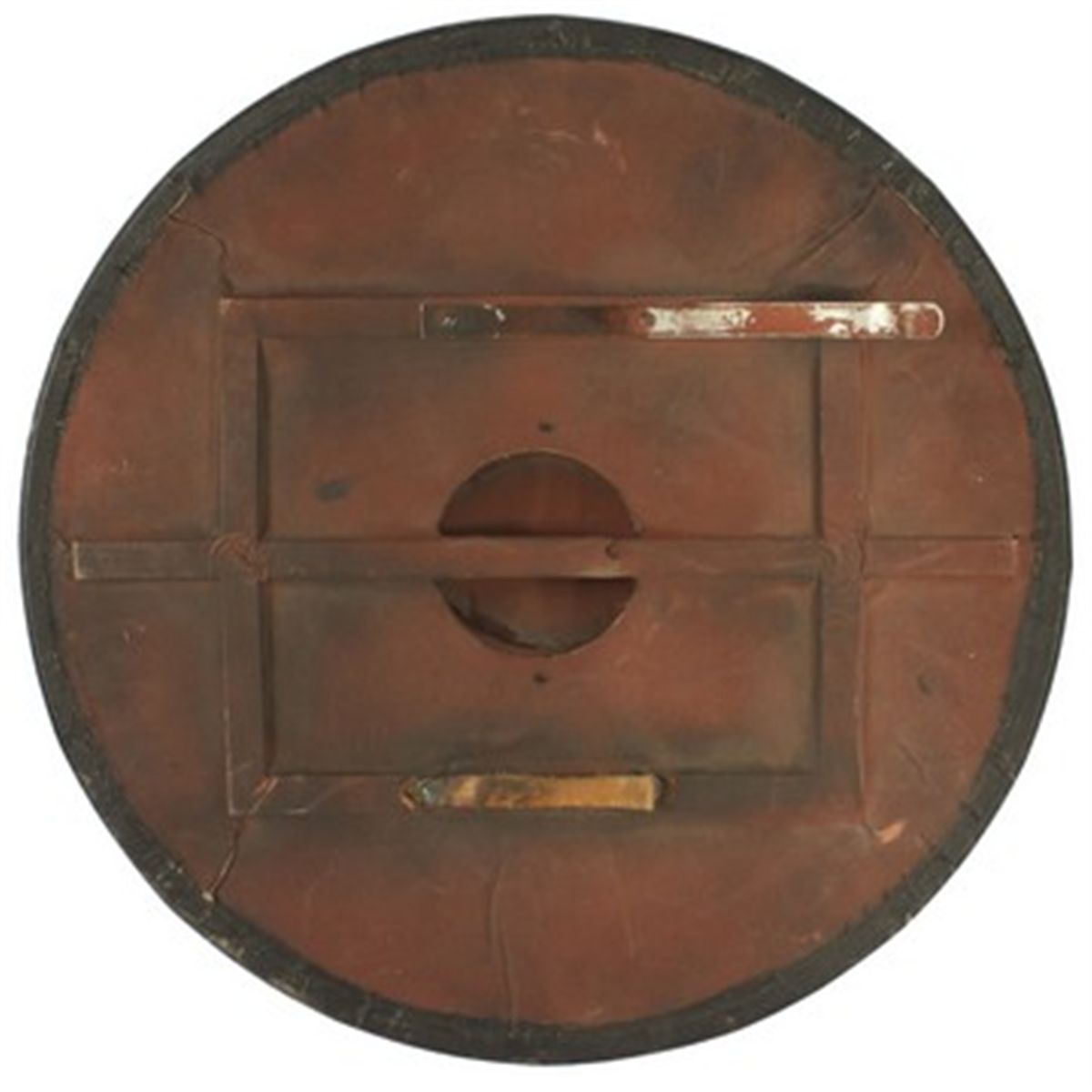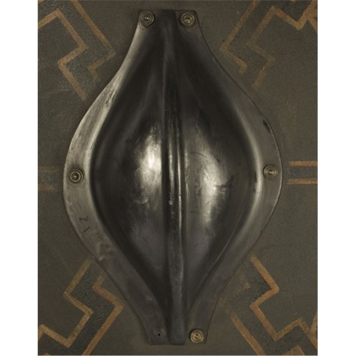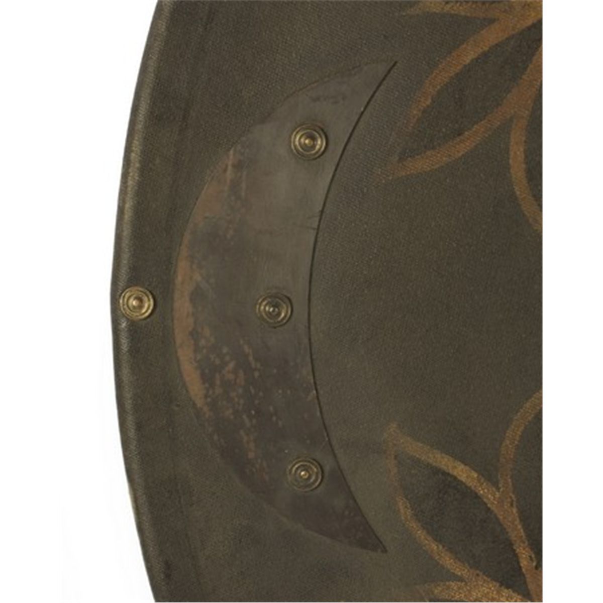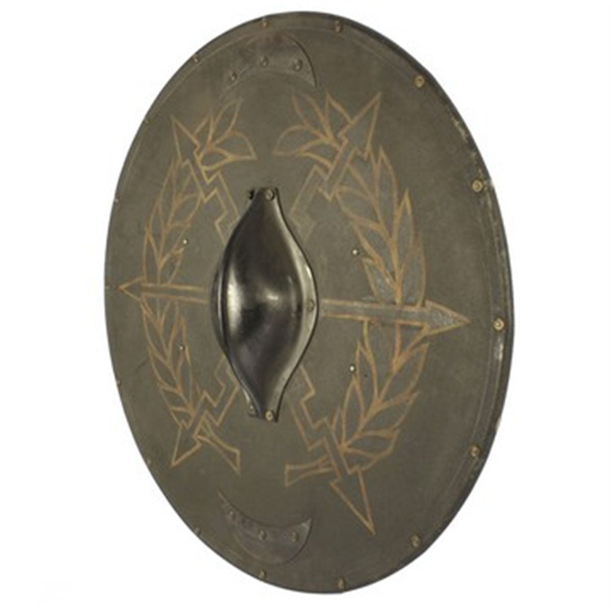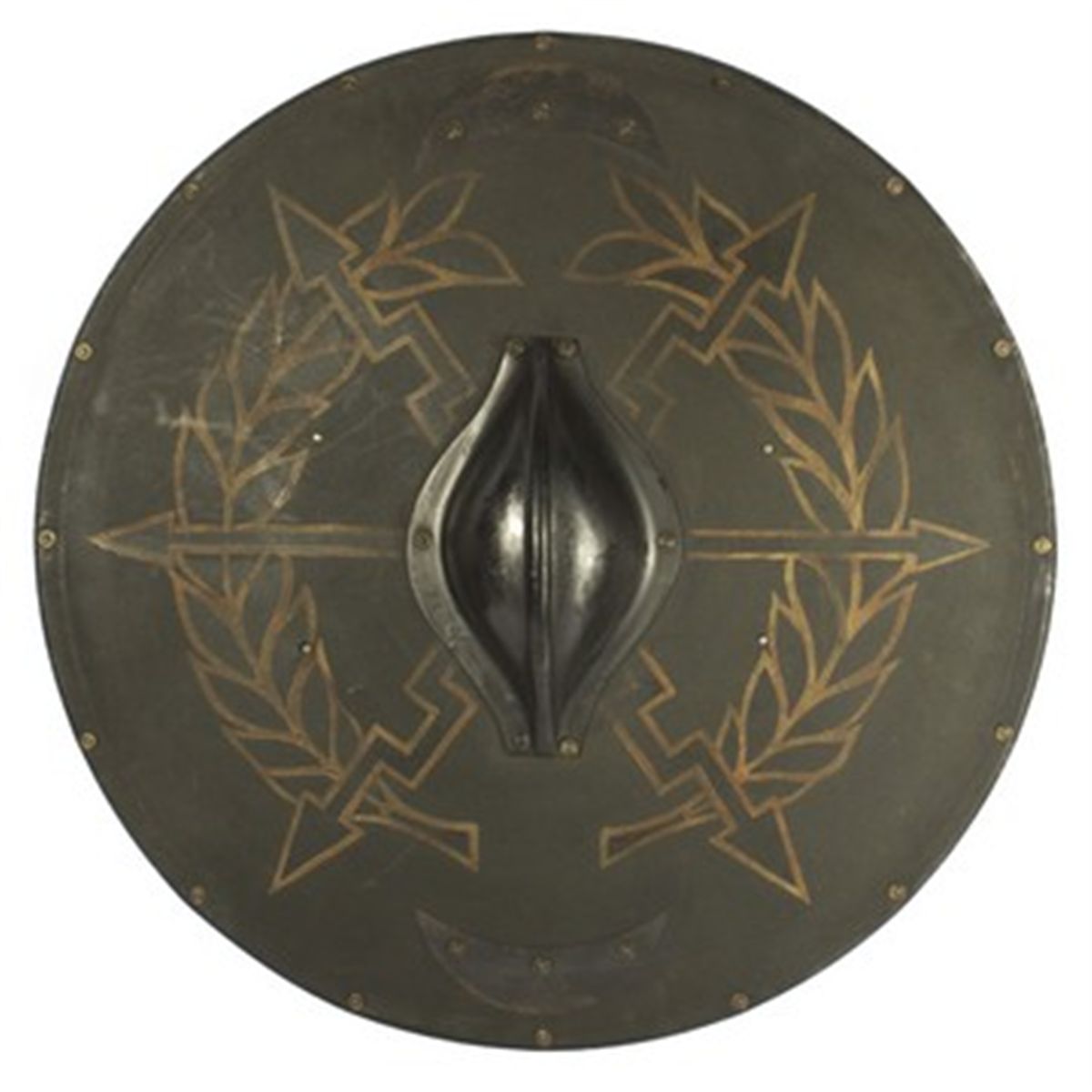 This prop shield was used by one of the Praetorian Cavalry background characters in the 2000 motion picture, "Gladiator." The round shield measures approx. 29" in diameter and is constructed of a round wooden panel covered with black and gold painted canvas. The front is decorated with a laurel and arrow motif and has metal crescents, a plastic boss in the center, and rivets around the outer edge. The back of the shield is painted red and has a leather handle on one side, metal bar on the other, and additional handle in the center.