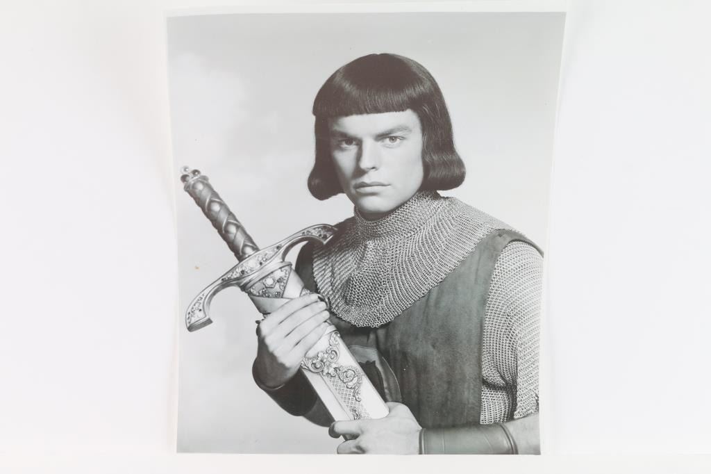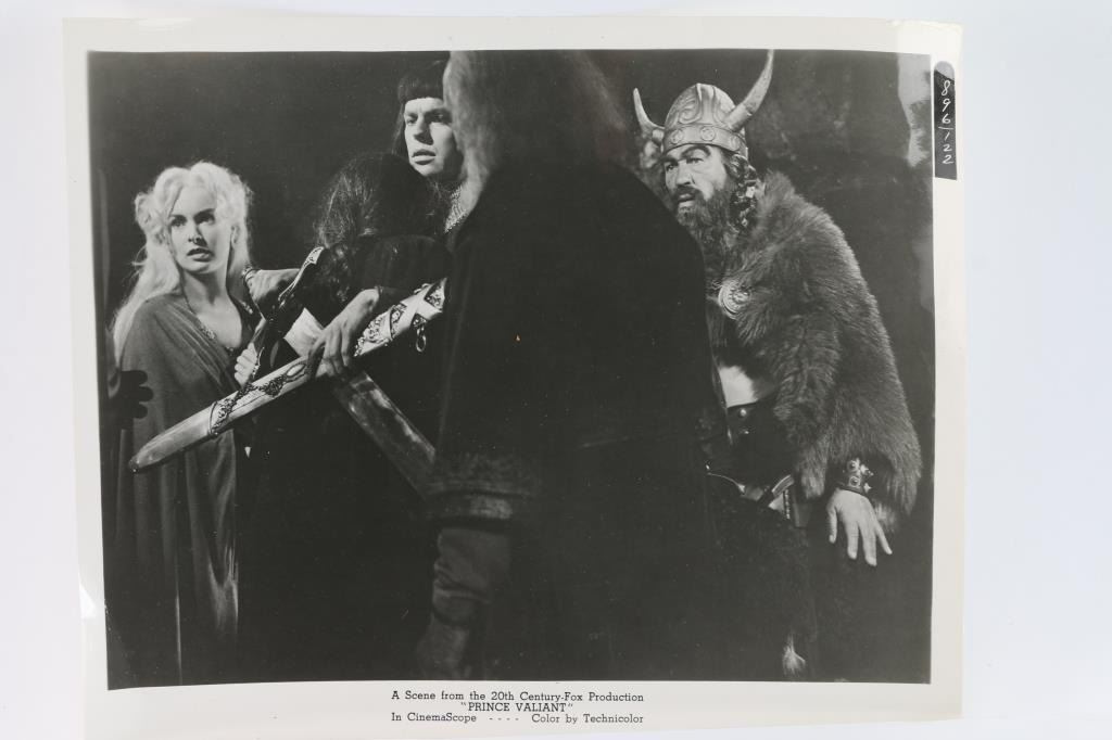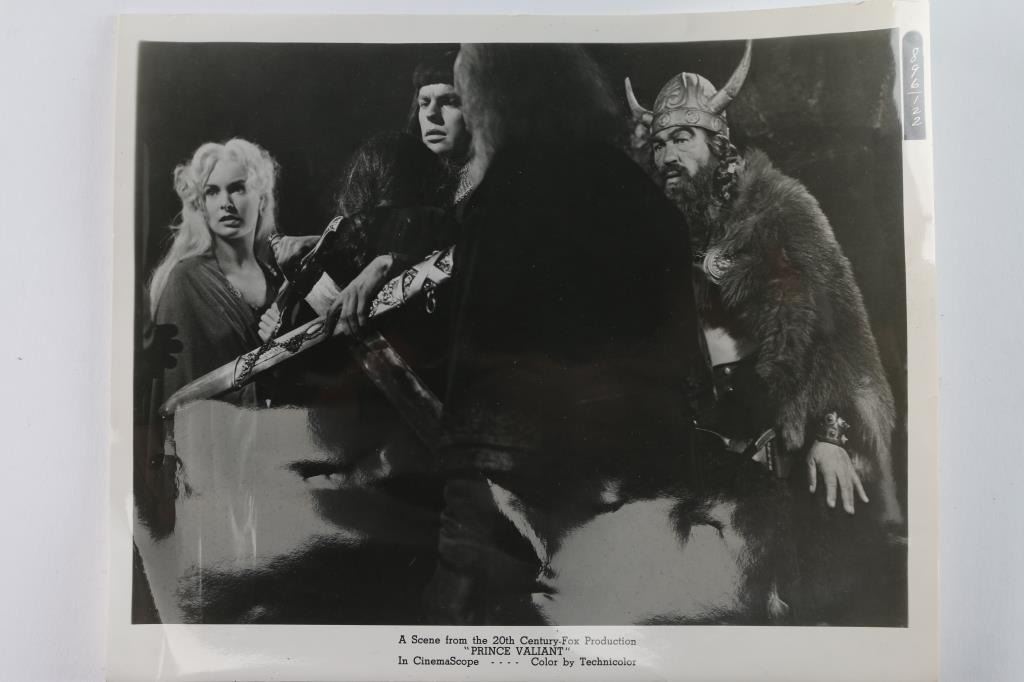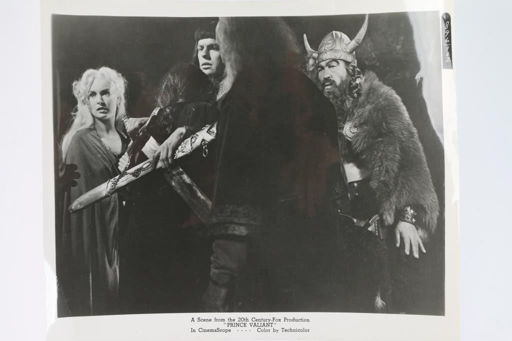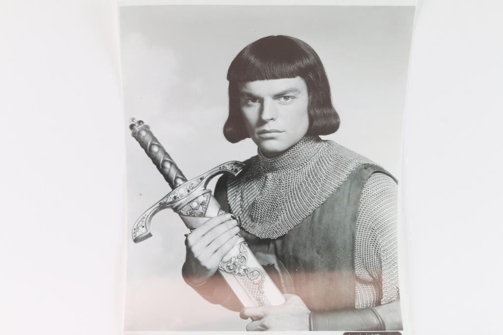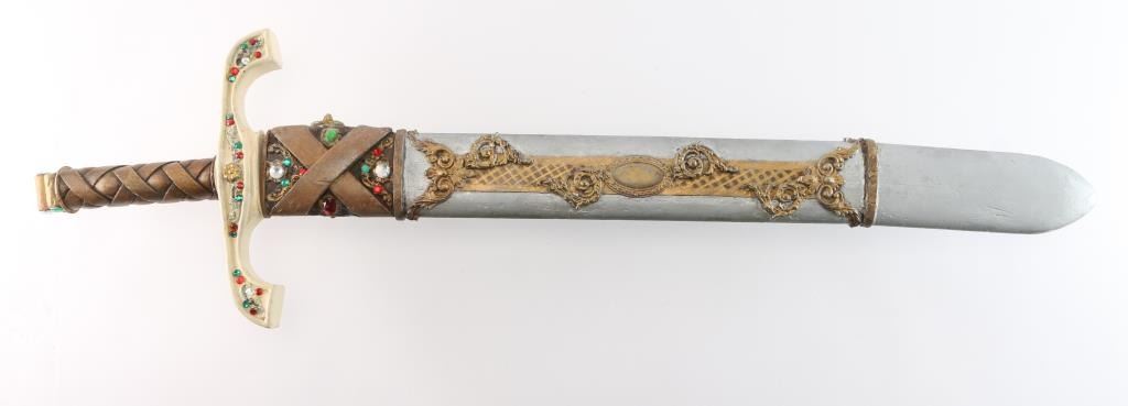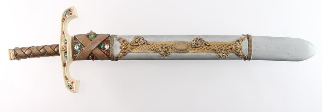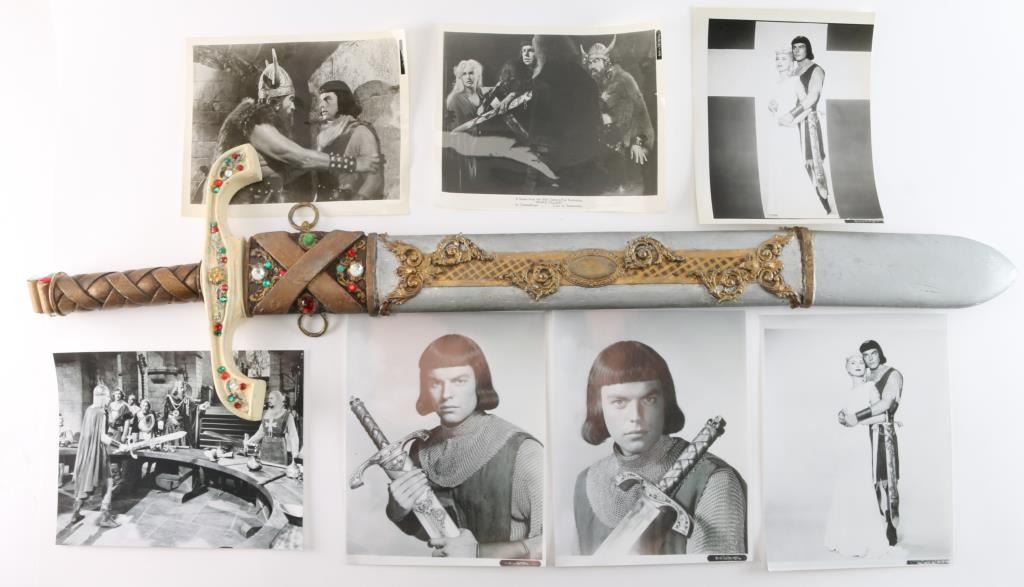 Epic movie starring Robert Wagner. Included is a photographic black and white archive of stills that feature this sword in most every major scene along with other stills that are important to the plot (70+ total with reproductions of comic strip featuring "the singing sword" after which this sword was patterned. The Prince Valiant comic strip is the longest running comic of all time and is still published in major newspapers today. Joe Musso, award winning movie artist, considered the artwork "the best" and was a lifetime fan of the series. Mr. Musso included this prop in his private museum until 2022 when sold to a fellow collector in So. California. This prop sword measures 43 overall constructed of light wood, faux jewels and is painted to appear leather wrapped. A false blade and aluminum blade are included. One faux diamond is missing from the pommel and otherwise condition is good. An iconic prop from the 1954 production that launched Robert Wagner to stardom. Also few weapons if any have ever been featured in so much "air time" in any major Hollywood production. The sword starred in most every scene!