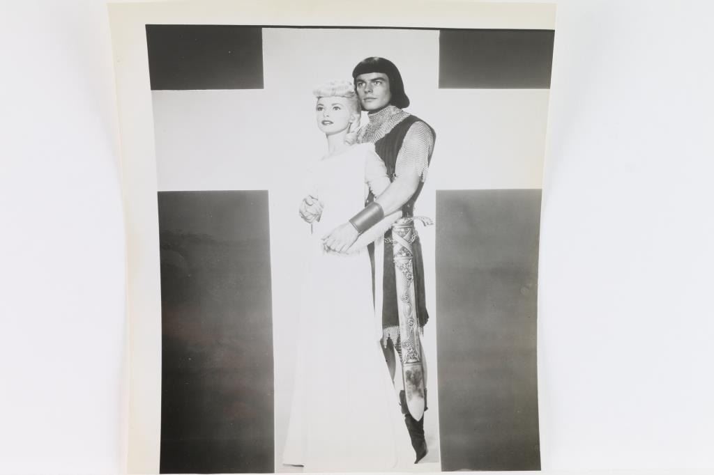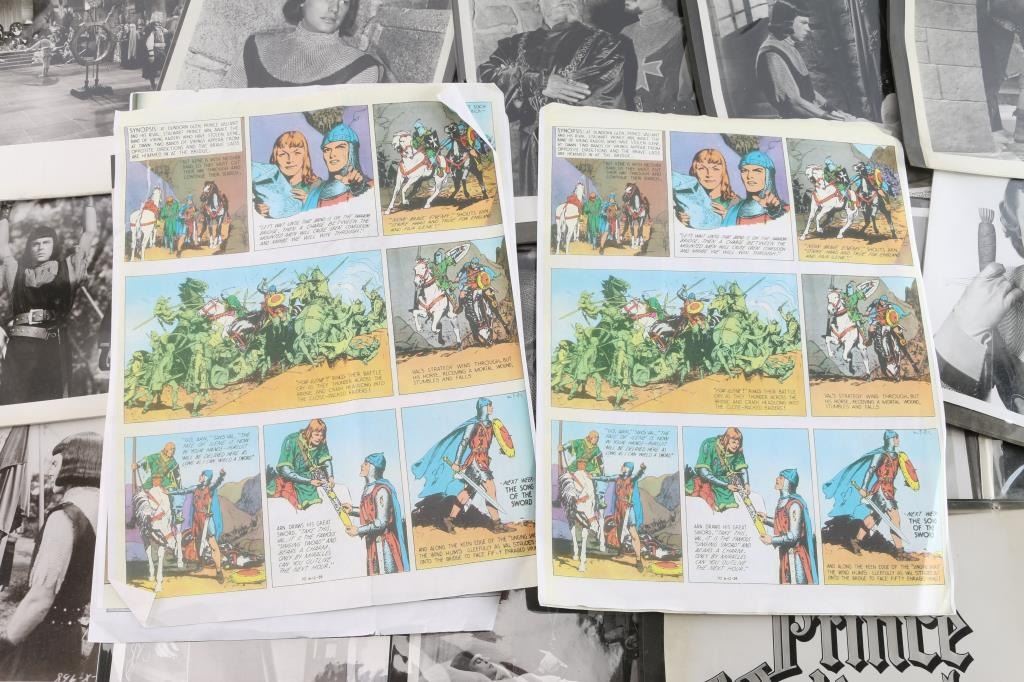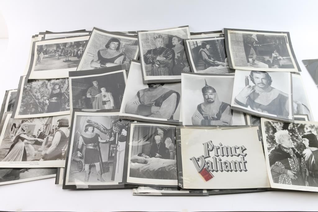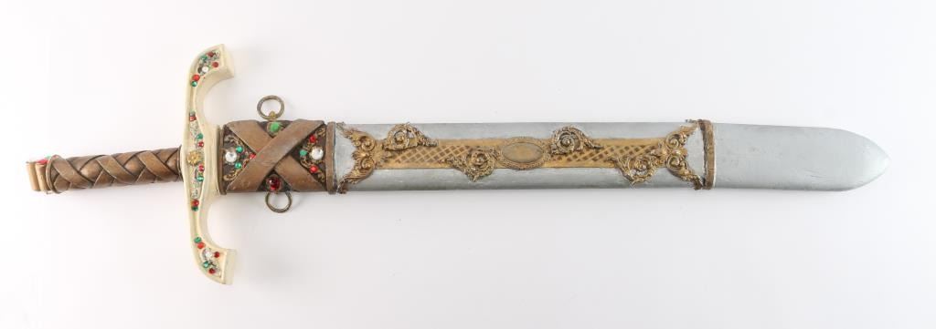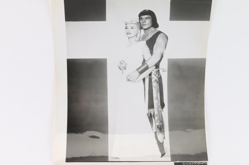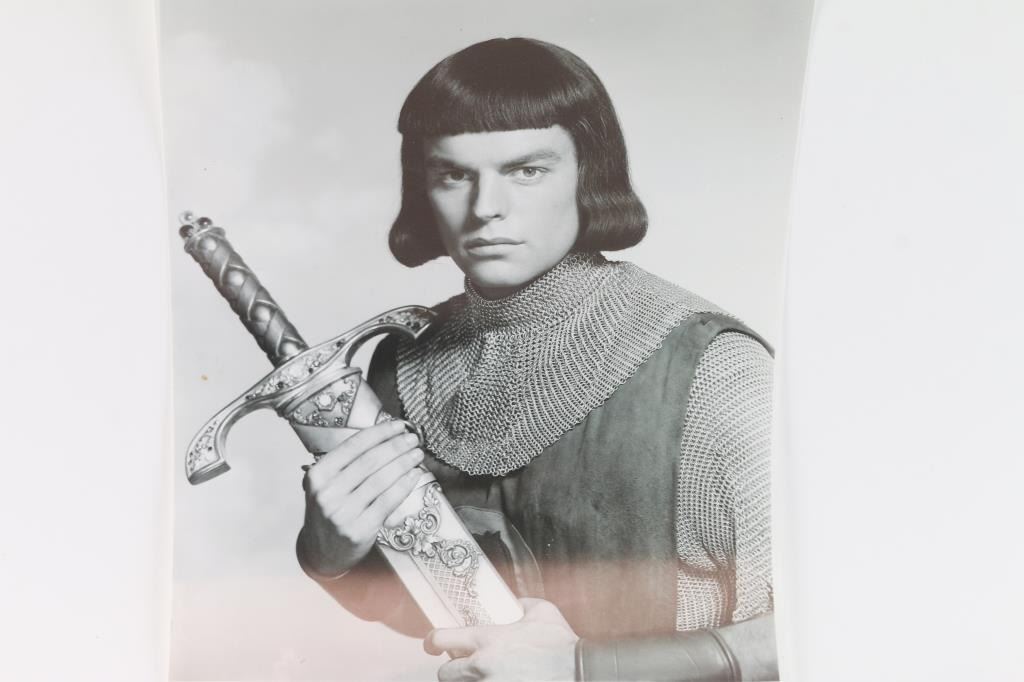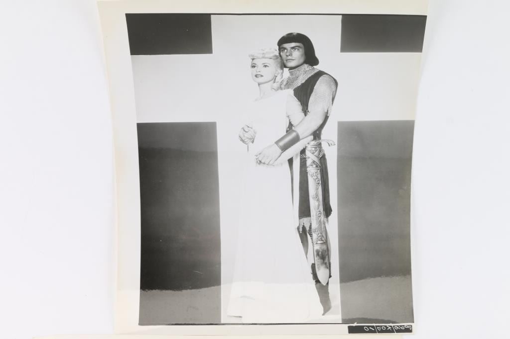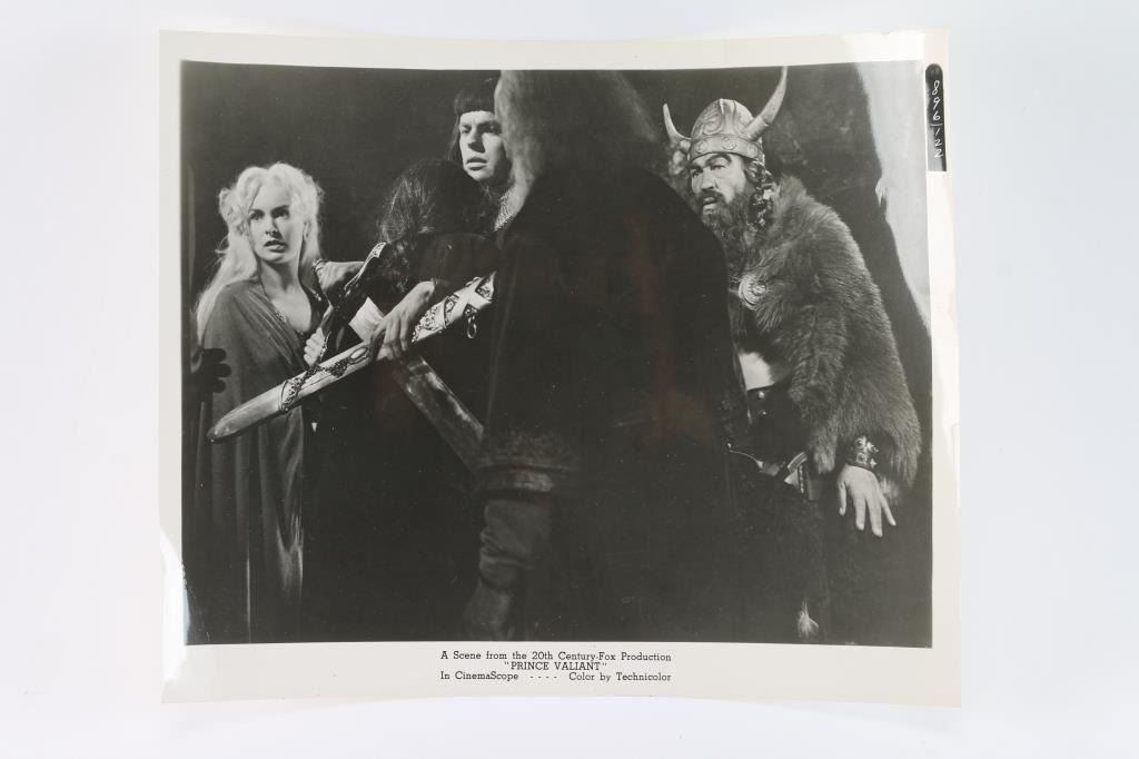 Epic movie starring Robert Wagner. Included is a photographic black and white archive of stills that feature this sword in most every major scene along with other stills that are important to the plot (70+ total with reproductions of comic strip featuring "the singing sword" after which this sword was patterned. The Prince Valiant comic strip is the longest running comic of all time and is still published in major newspapers today. Joe Musso, award winning movie artist, considered the artwork "the best" and was a lifetime fan of the series. Mr. Musso included this prop in his private museum until 2022 when sold to a fellow collector in So. California. This prop sword measures 43 overall constructed of light wood, faux jewels and is painted to appear leather wrapped. A false blade and aluminum blade are included. One faux diamond is missing from the pommel and otherwise condition is good. An iconic prop from the 1954 production that launched Robert Wagner to stardom. Also few weapons if any have ever been featured in so much "air time" in any major Hollywood production. The sword starred in most every scene!