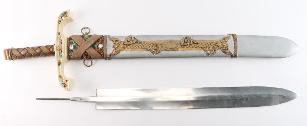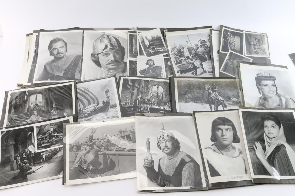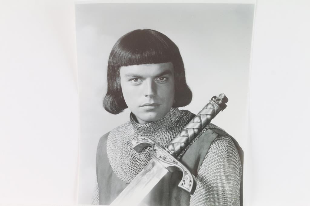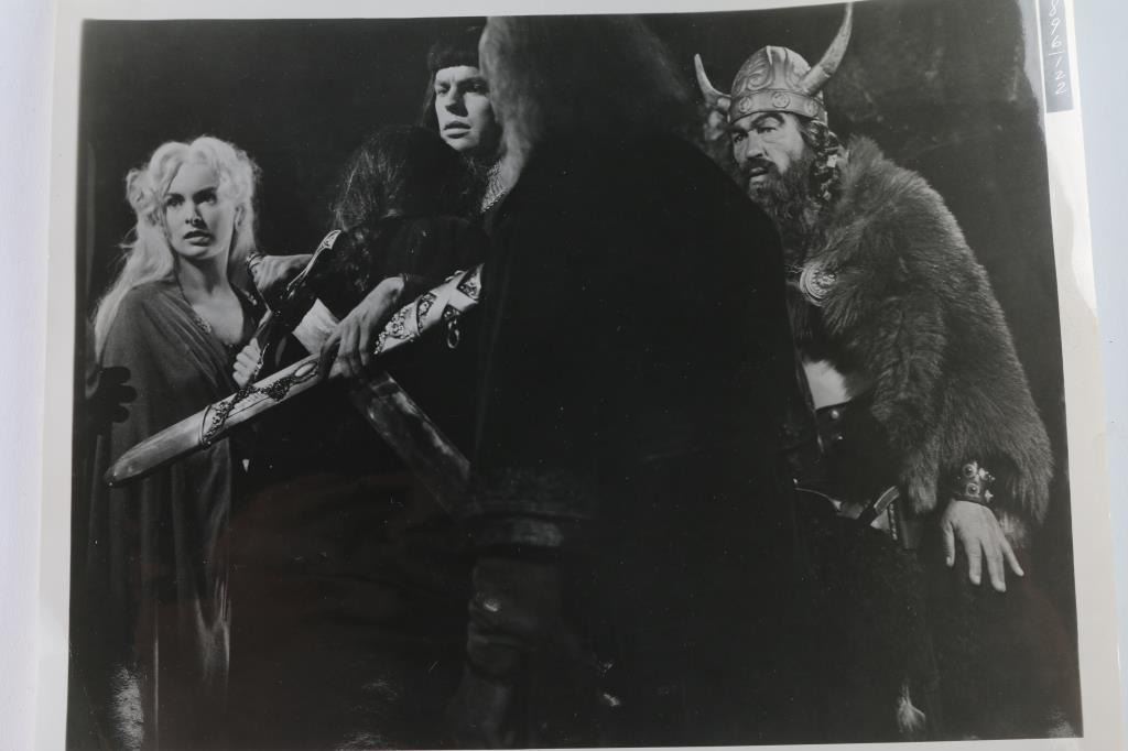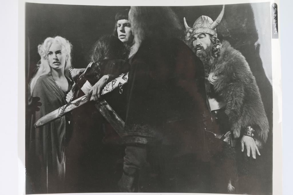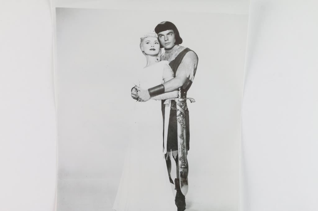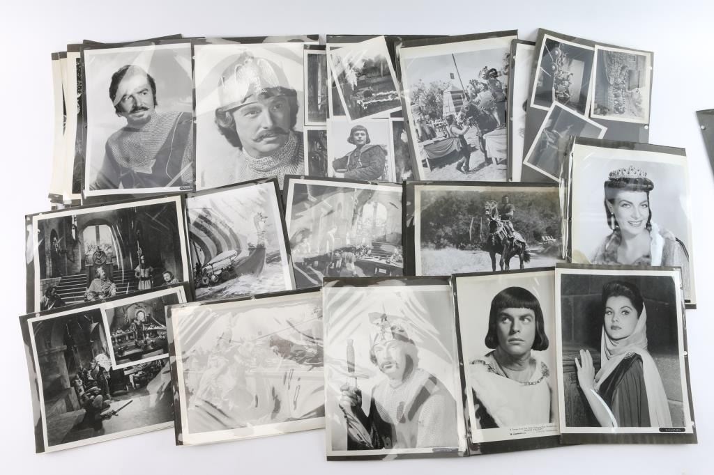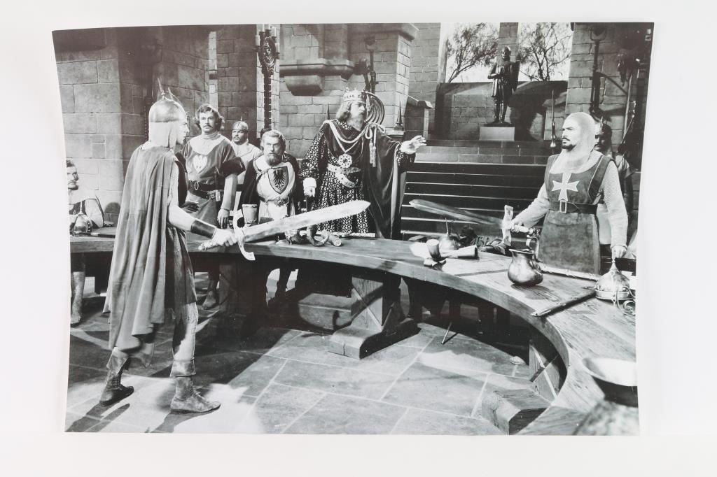 Epic movie starring Robert Wagner. Included is a photographic black and white archive of stills that feature this sword in most every major scene along with other stills that are important to the plot (70+ total with reproductions of comic strip featuring "the singing sword" after which this sword was patterned. The Prince Valiant comic strip is the longest running comic of all time and is still published in major newspapers today. Joe Musso, award winning movie artist, considered the artwork "the best" and was a lifetime fan of the series. Mr. Musso included this prop in his private museum until 2022 when sold to a fellow collector in So. California. This prop sword measures 43 overall constructed of light wood, faux jewels and is painted to appear leather wrapped. A false blade and aluminum blade are included. One faux diamond is missing from the pommel and otherwise condition is good. An iconic prop from the 1954 production that launched Robert Wagner to stardom. Also few weapons if any have ever been featured in so much "air time" in any major Hollywood production. The sword starred in most every scene!