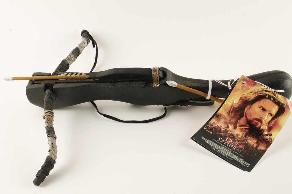 Prop stunt crossbow and two prop stunt arrows used by the ninjas in their attack on the Samurai camp in the popular movie “The Last Samurai” starring Tom Cruise, with Certificate of Authenticity from Back Lot Props & Costumes and photo. Est.: $200-$400.