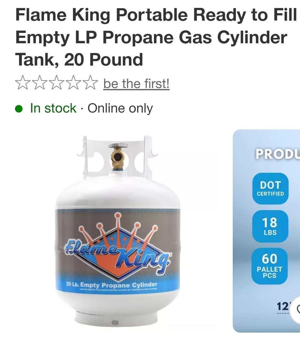 Flame King 20 lb empty cylinder, portable and ready for refill, DOT certified, new.