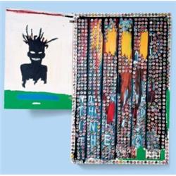 As the present work, SELF-PORTRAIT, 1985, demonstrates, the human figure remained the central focus of Basquiat's paintings. "Basquiat's career divides into three broad though overlapping phases, each characterized by a shift of style, subject matter, and reference. In the earliest, from 1980 to late 1982, Basquiat used painterly gestures on canvas, most often depicting skeletal figures and mask-like faces that signal his obsession with mortality, and imagery derived from his street existence, such as automobiles, buildings, police, children's sidewalk games, and graffiti.... He quickly abandoned the automobile and cityscape as subject, and introduced his unique depiction of man, specifically black man. Basquiat's early figures are frontal and flat, of stick-figure simplicity, and often partially reveal their internal skeleton and organs. Most pronounced is a halo or crown of thorns that lends the figures a superiority, specialness, and religious aura" (Richard Marshall, "Repelling Ghosts," ibid., pp. 15-16). Basquiat's aforementioned death obsession may be noted in the present figure, whose torso seems painfully severed just below the shoulders. Here the body suddenly terminates in ragged brushstrokes and dripping pigment. Also notable is the simple frontal and flat conception of the head, which is made intense by the black contours of paint, which then crown his head with wild shoots of his twisted, dreadlock hair, and Basquiat paints the eyes and mouth dramatically in white, giving the appearance of both fear and surprise. Moreover, the boldly painterly gesture of SELF-PORTRAIT, in addition to the collaged element arrangement creates a powerful image, and ultimately a Basquiat masterwork.