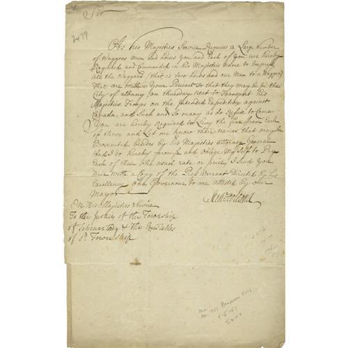 <B>(Proposed Expedition to Conquer French Canada) Henry Holland, Jr. (1704 - c.1782), prominent Albany, New York jurist and military officer, manuscript Document Signed,</B></I> "<I>Henry: Holland</B></I>" as commissary, one page, 8" x 13", [Albany], docketed October 13, 1746 to "<I>...the Justices of the Township of Schenectady...</B></I>" ordering them "<I>...to Impress All the Waggons (that is two horses and one Man to a Waggon) That are within Your Precinct so that they bay be in the City of Albany on Thursday next to Transport his Majesties Troops on the Intended Expedition against Canada...</B></I>" The planned expedition was part of what was known in America as "King George's War" (1744-1748), one of several wars fought between Britain and France in the eighteenth century. The planned expedition did not come to fruition but was likely to have been in retaliation for the French raid on Saratoga the previous year. Usual folds, a few marginal chips and tears, else Very Good. An interesting, early document from one of the numerous aborted attempts to conquer Canada. (Maple syrup would so much cheaper if one had been successful!) The British finally succeeded in resting control of that country from the French when Quebec fell in 1759. From the Henry E. Luhrs Collection.