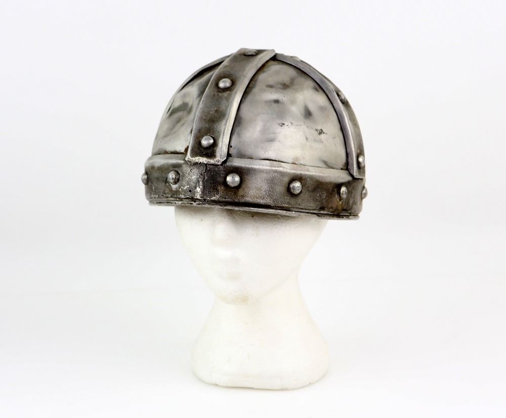 Props - Barbarian helmet used in Robin Hood and The Three Stooges, together with two armoured helmet