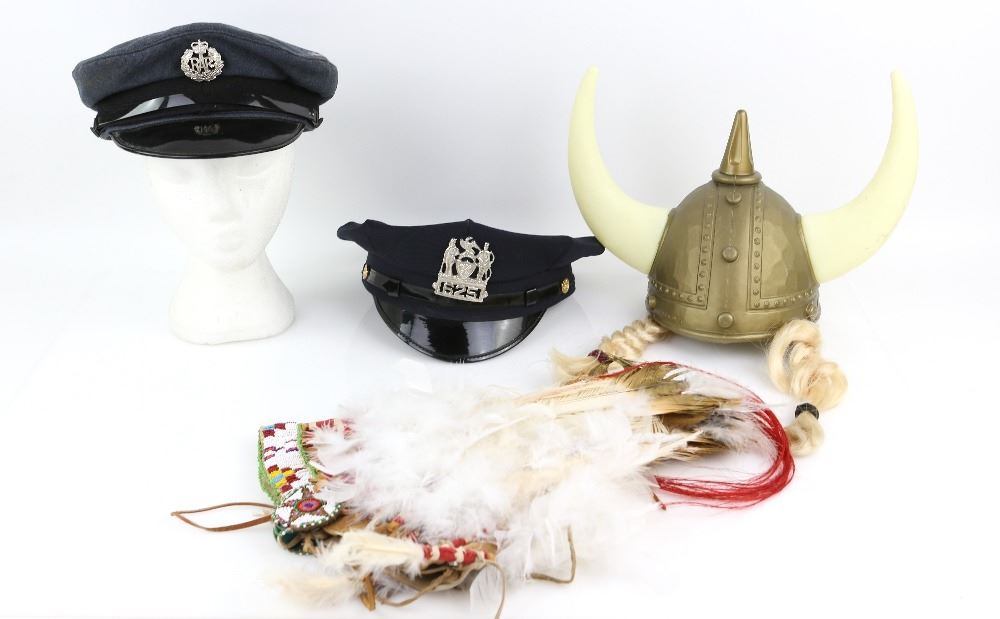 Props - Native American feather head dress used in various productions including John Wayne westerns, Western Costume Co barcode (40336191) within, together with a plastic Viking helmet used in comedy shows such as Spike Milligan's Q series, and a New York Police Officer's hat and a chauffeur's cap from various film and television productions.