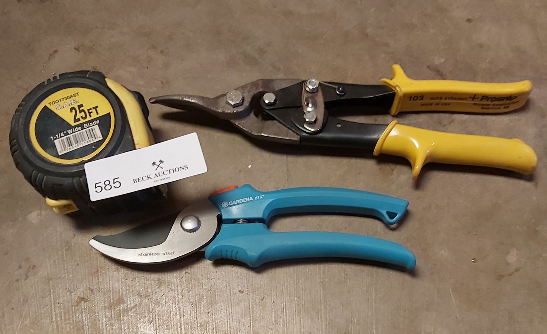 Prosnip Tin Cutters, Measuring Tape, Gardena Pruning Shears, and Measuring Tape