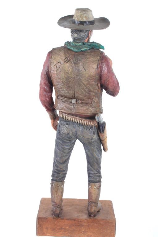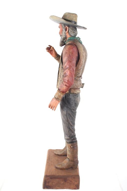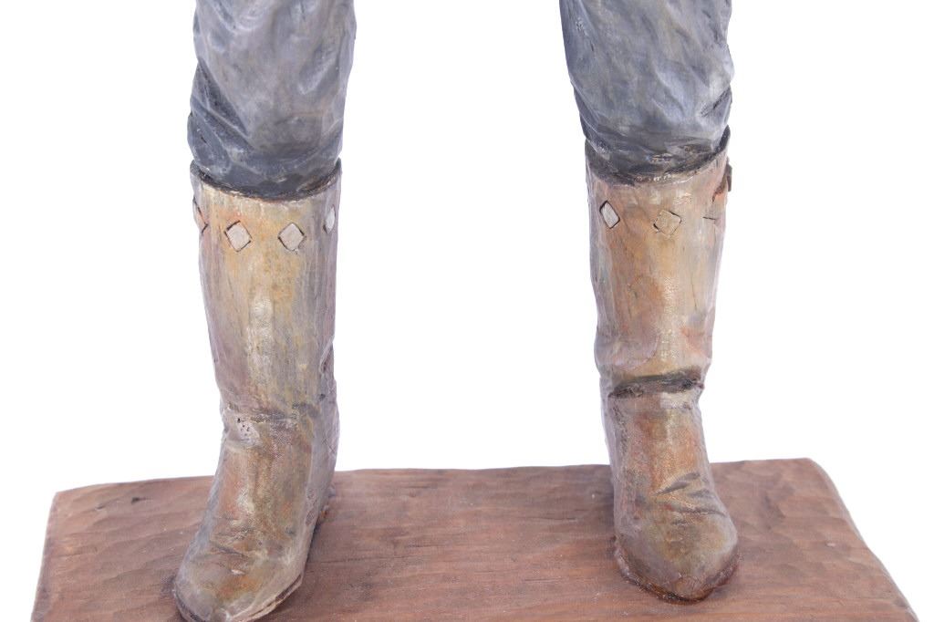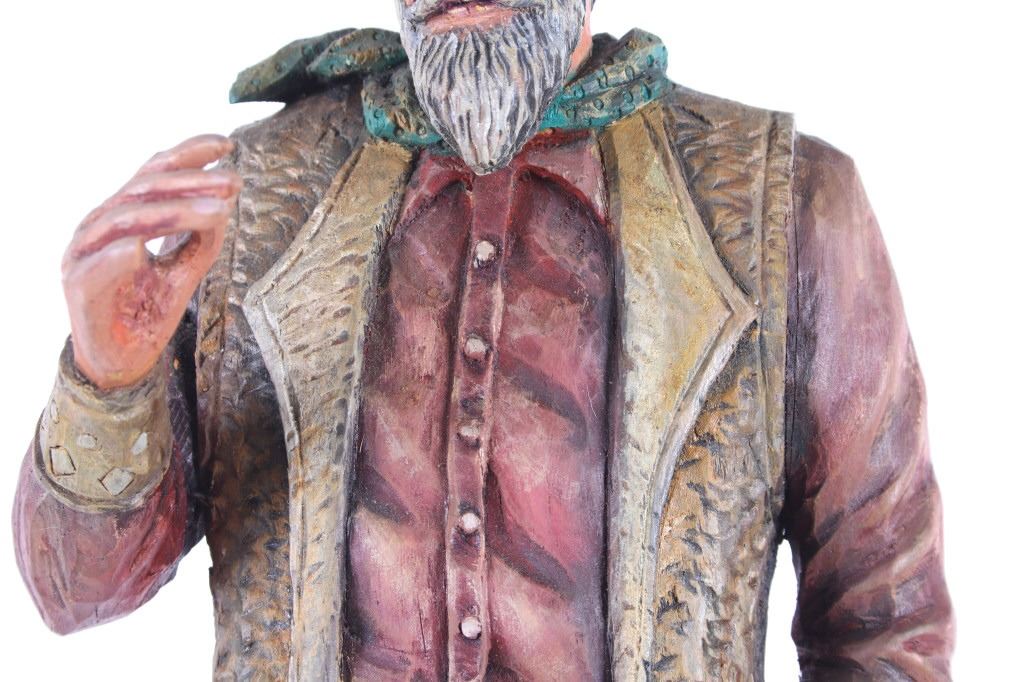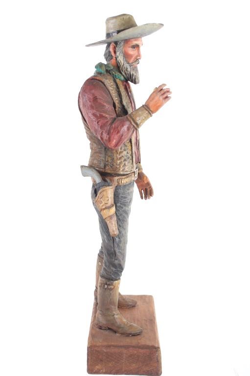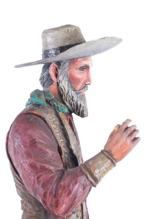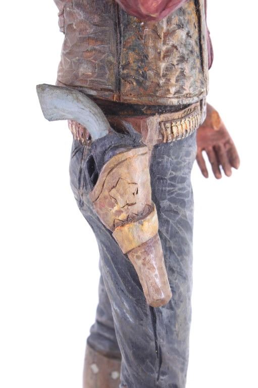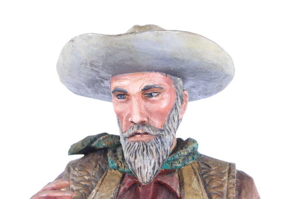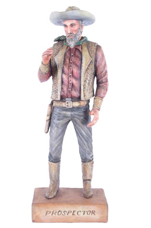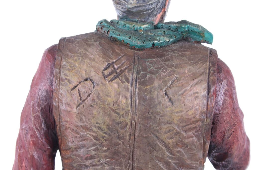 This lot is a hand carved Western folk art titled, "Prospector" signed by acclaimed Western folk art carver, Dee Flagg. Dee Flagg, (1922-1999), was a well-known artist, who was known for western images in wood carvings and paintings. A colorful character with a handlebar mustache who often dressed like Buffalo Bill Cody, Flagg began carving intricate figures and Old West scenes at age 5, using only hand tools. His 65-year career earned him scores of awards and artistry honors, including Best in Show at the world's largest woodcarver's exhibition in Toronto. In Scottsdale and the Southwest, the name of Dee Flagg is synonymous with authentic life-size carved characters of the Old West. His work was also marketed by Knott's Berry Farm in California and is prominent in the collections of Gene Autry and Roy Rogers. The collection of the Flagg family estate is now a major part of the Bison Museum in Scottsdale, Arizona. This wood carving is stunning in its detail and colour. The piece is in good condition,end of left thumb and right pinky appear missing. Measurements are 16.5"H x 6"L x 3.25"W