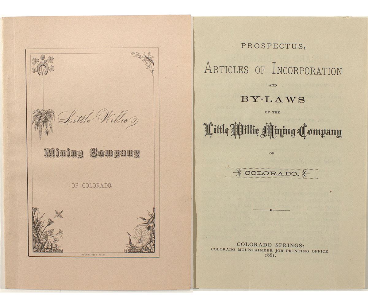 Prospectus, Articles of Incorporation, and By-laws. 16 pages. Ruby Mining District. This silver mining company owned property "in the heart of the district," bought in June 1876. Claims include: Little Willie, Green Mountain Boy, Uncle Sam, and Spike Tail Lodes. "These lodes have been worked only to the extent necessary to secure title, yet some very rich mineral has been taken out, running mainly to silver, but showing some gold." Softcover. Very fine. 6" x 4"