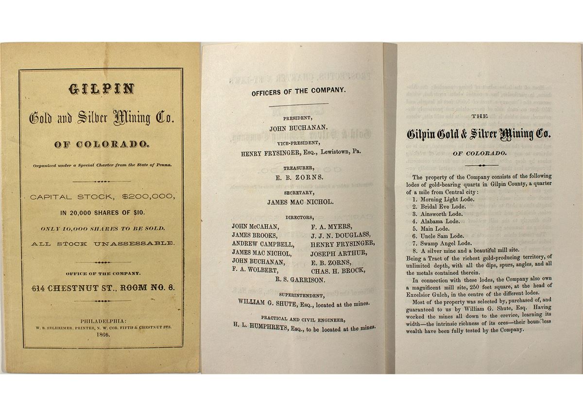 24 pages. No map. Offices in Philadelphia, Organized under a special charter in Pennsylvania. Prospectus, Charter & By-Laws. President is John Buchanan, and the superintendent is William G. Schute. The company's claims consist of "lodes of gold-bearing quartz in Gilpin County, a quarter of a mile from Central City," including: Morning Light Lode, Bridal Eve Lode, Ainsworth Lode, Alabama Lode, Main Lode, Uncle Sam Lode, Swamp Angel Lode, a silver mine and a beautiful mill site. "Being a tract of the richest golf-producing territory, of unlimited depth, with all the dips, spurs, angles, and all the metals contained within." Softcover with string binding. Vertical fold. 7.5" x 4.5"