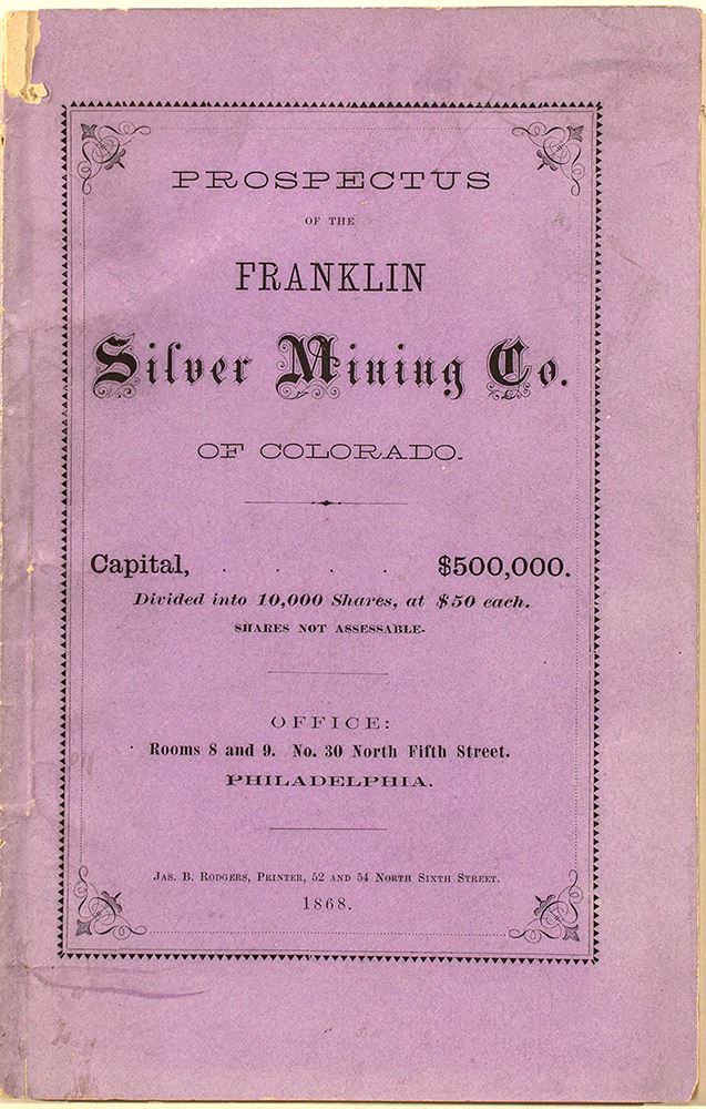 From the report: "The Franklin Lode is a lode well-known to every miner in Colorado. It is situated in Clear Creek county, in the Territory of Colorado,Idaho Mining District, three miles and a half from Central City, the queen of mountain towns of the Territory." William Talbot states: "he has never seen in any of the mines as large a vein of solid mineral as appears in the Said Franklin Lode; nor has he seen any other lode in the territory which can be more easily or advantageously worked." L '(7.5" x 4 7/8") 22 pp. Condition good, small tear in upper left corner of cover.