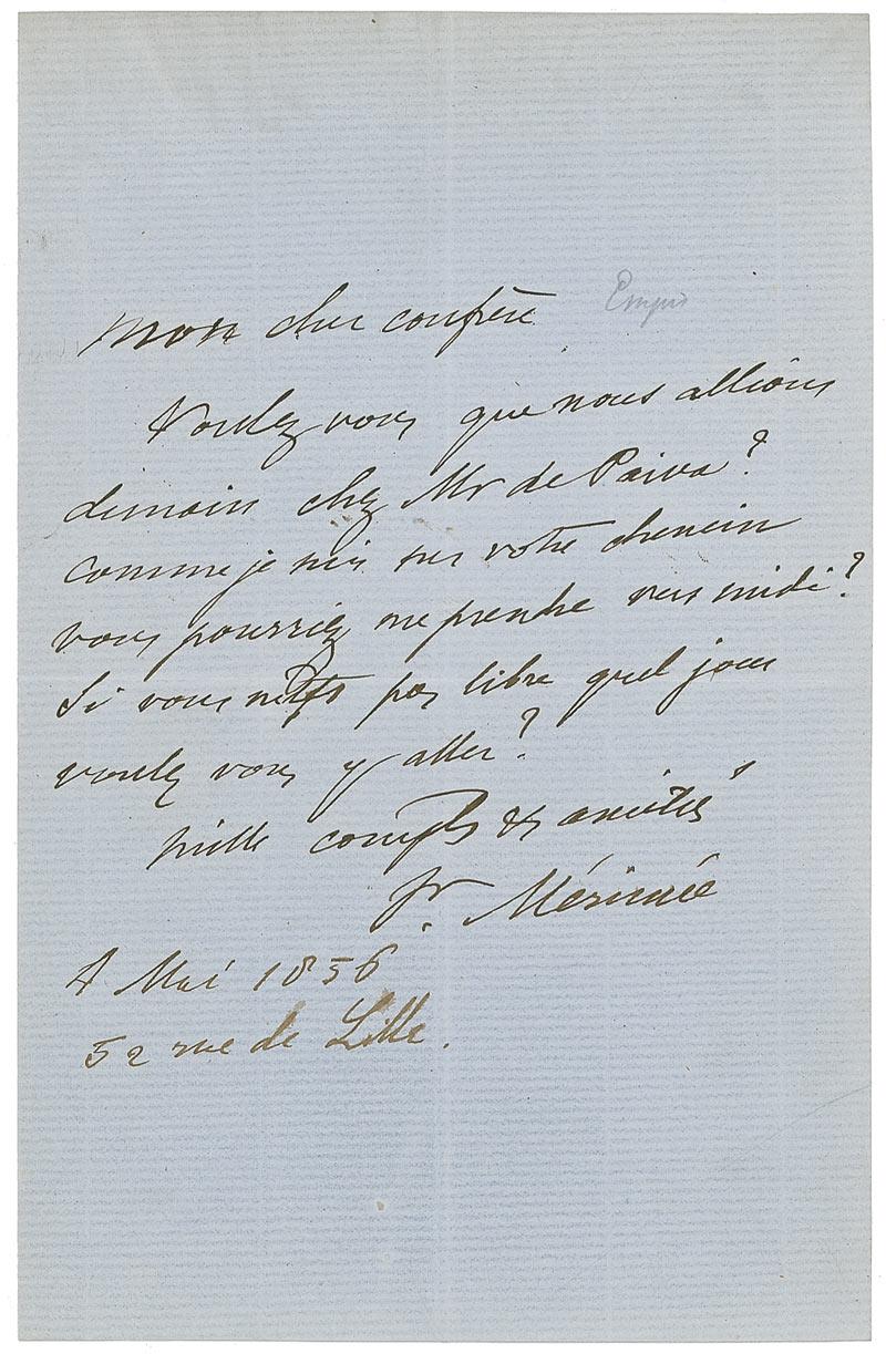 French dramatist, historian, archaeologist, and short story writer (1803-1870). One of his stories was the basis of the opera Carmen. ALS in French, signed “Pr. Merimee,” one page, 5.25 x 8, May 4, 1856. Untranslated letter to a friend. In fine condition, with central horizontal and vertical fold, one through a single letter of signature, small pencil notation near top, and a bit of scattered light toning.