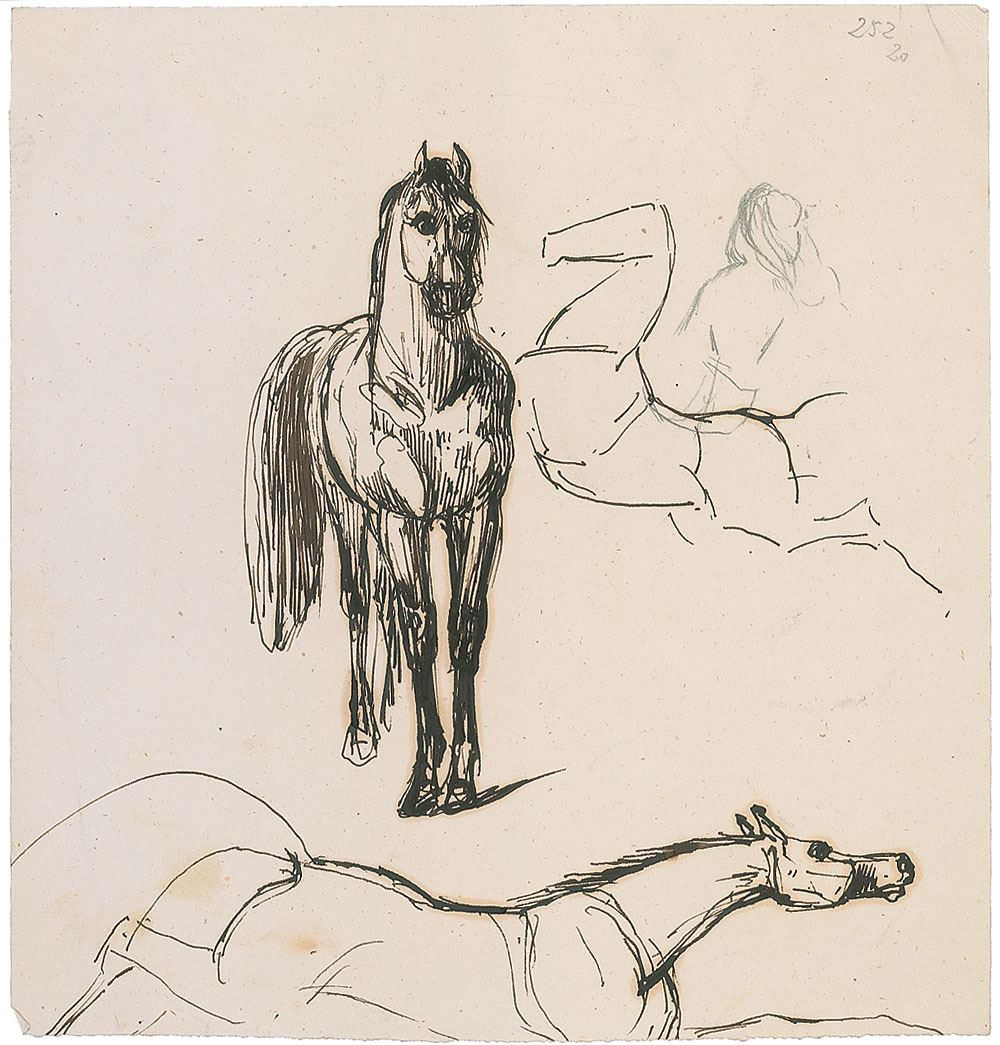 French dramatist, historian, archaeologist, and short story writer (1803–1870); one of his stories was the basis of the opera Carmen. Original ink sketch of horses in various states accomplished by Merimee on an off-white 6.5 x 7 sheet, with Merimee adding a pencil sketch of a turbaned rider to the outline of a leaping horse. In fine condition, with subtle creases and foxing.