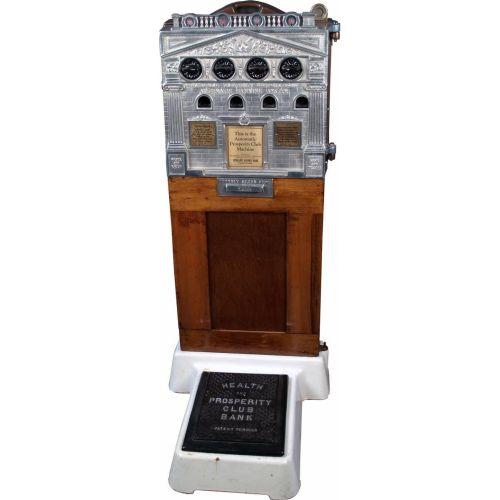 Prosperity Club Bank & Scale. This banking scale accepts coins from 25 cent to $1 plus $5 gold pieces was made by Joseph Schermack. It was designed to provide children an incentive to save money. Upon depositing a coin, the patrons weight is given and a receipt of deposit is issued. While the machine provided physical and fiscal incentives, it was short lived. The scale is marked #2