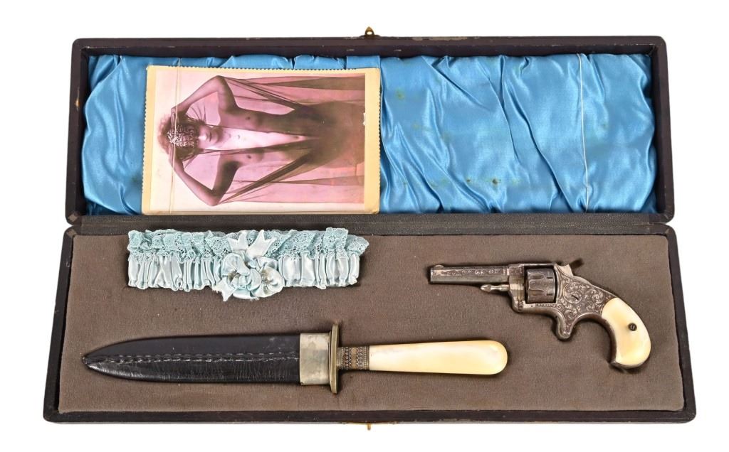 Cased Gun, garter belt, knife, with photo. Engraved Hopkins & Allen XL No. 1. Spur Trigger Revolver. Filed down hammer, mother of pearl grips, with 2.5" octagon barrel. Dufilho New Orleans knife 7 scabbard. Mother-of-pearl handle, Blade measures 6", with 10.5" overall length. Antique