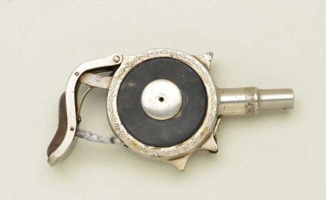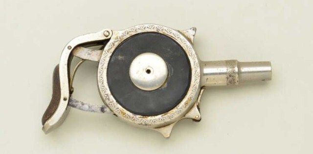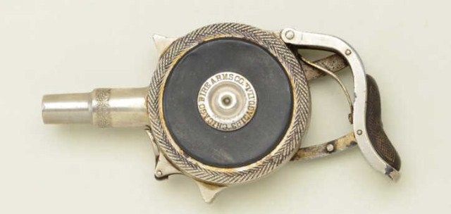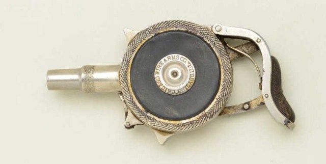 Protector palm squeezer by Minn. Fire Arms Co. in .32 caliber extra short showing patent March 6, 1883. Serial #2698. The palm squeezer is in good to original condition showing 50%-70% nickel with has dulled andtoned, some pitting and erosion wear the finish is missing. The back piece attached to cocking arm is missing. The action is sticking on safety and only partially working. The side grip panels show wear andgenerally fair to good condition. From an old N.Y. Collector’s Estate. Est.; $600-$1,200