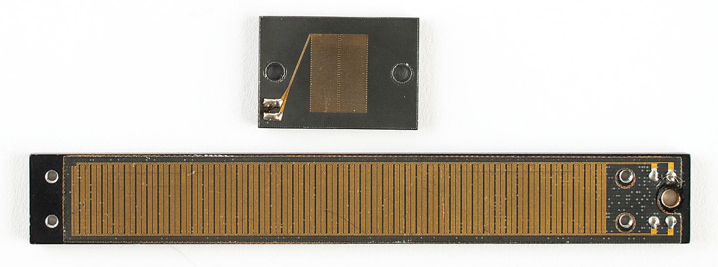 The smaller of the two pieces, measuring 1 7/16˝ x 1˝ x less than 1/8˝ thick, appears to have a continuous loop of gold attached to a glass substrate. The longer piece, measuring 5 15/16˝ x 13/16˝ x 1/8˝ thick, has two gold loops attached to an insulator which in turn is attached to a metal strip. The smaller piece has two leads mounted to it while the larger has four. The larger unit may of had a charge applied to one of the loops and used the other to pick up signals since it has four leads. Conversely, the smaller piece, acting as a coil, may have induced an electromagnetic field which was picked up by the larger piece when it passed by, creating some kind of analog signal which could then be processed into drum track position. In any case, precise workmanship was put into creating this fence system. Under magnification, they look like pieces of art! The smaller piece is displayed in a Riker box, with a magnified close-up image of its surface above. Also includes a color glossy 8.5 x 11 enlargement of the same image, revealing the intricate detail of the gold loop. In overall fine condition.