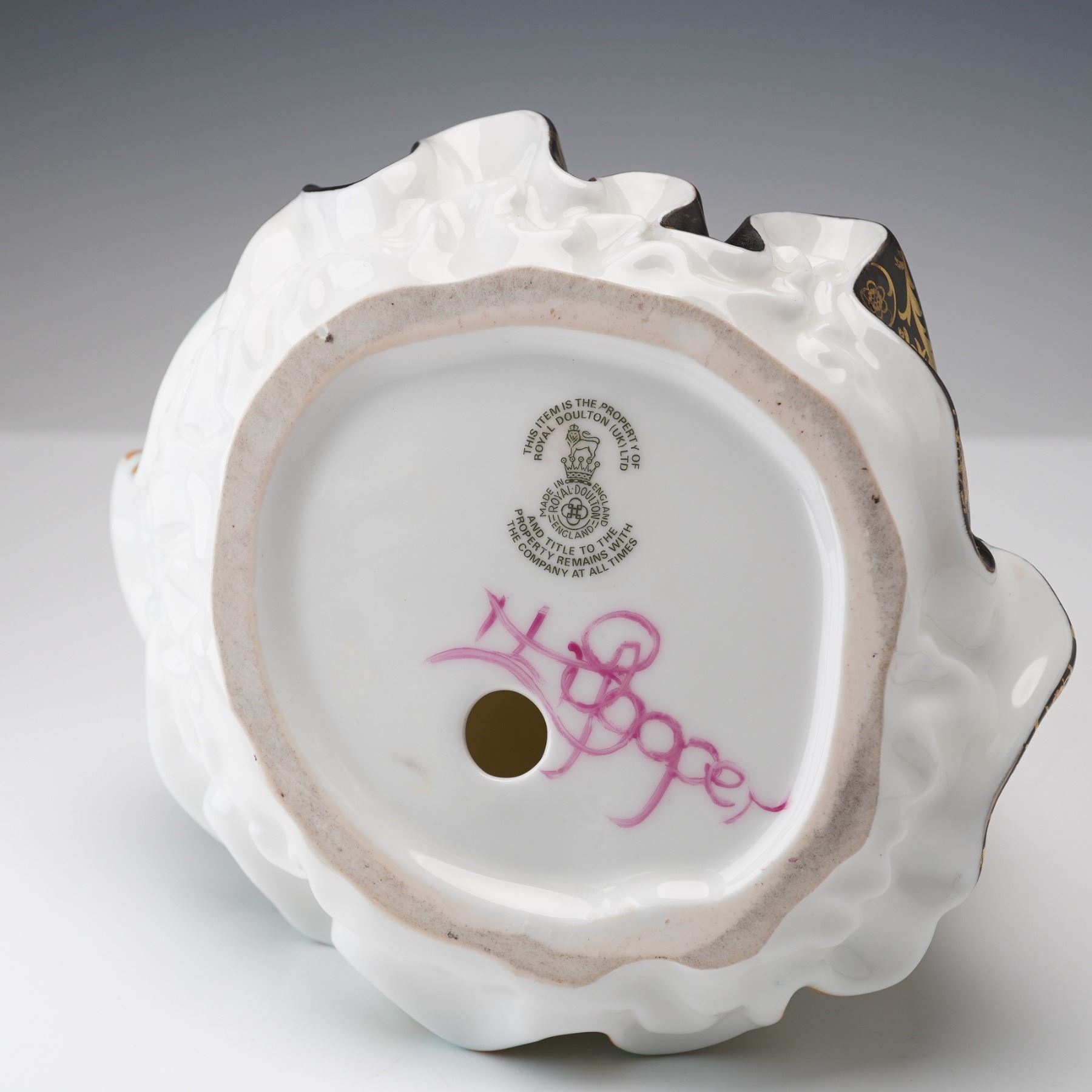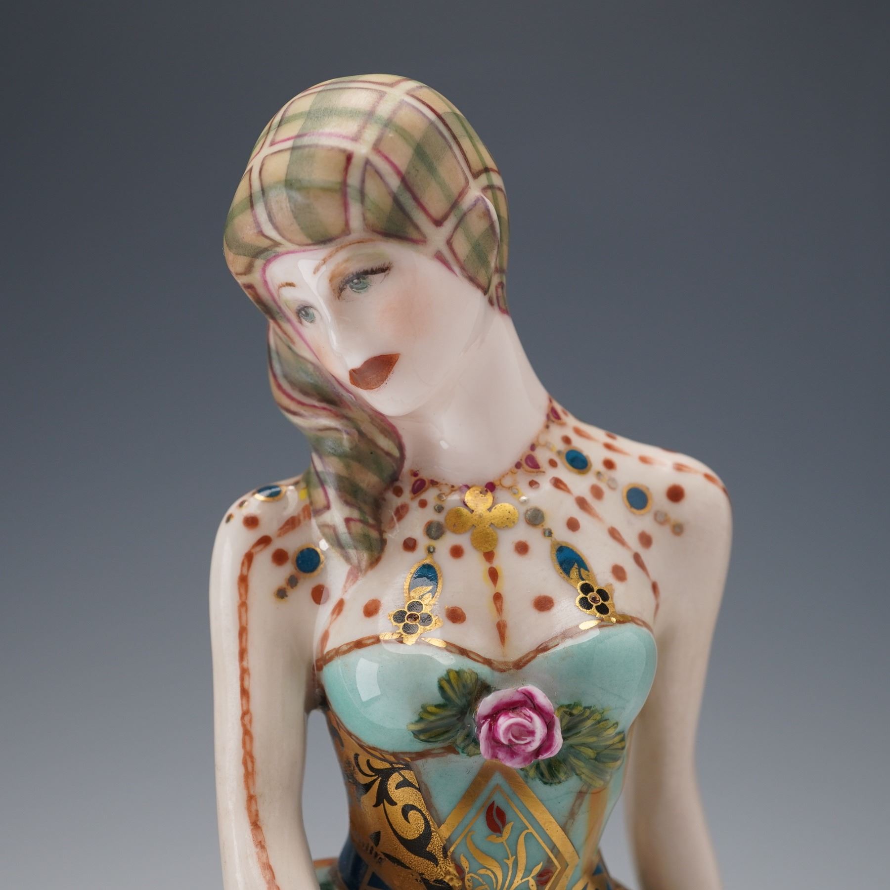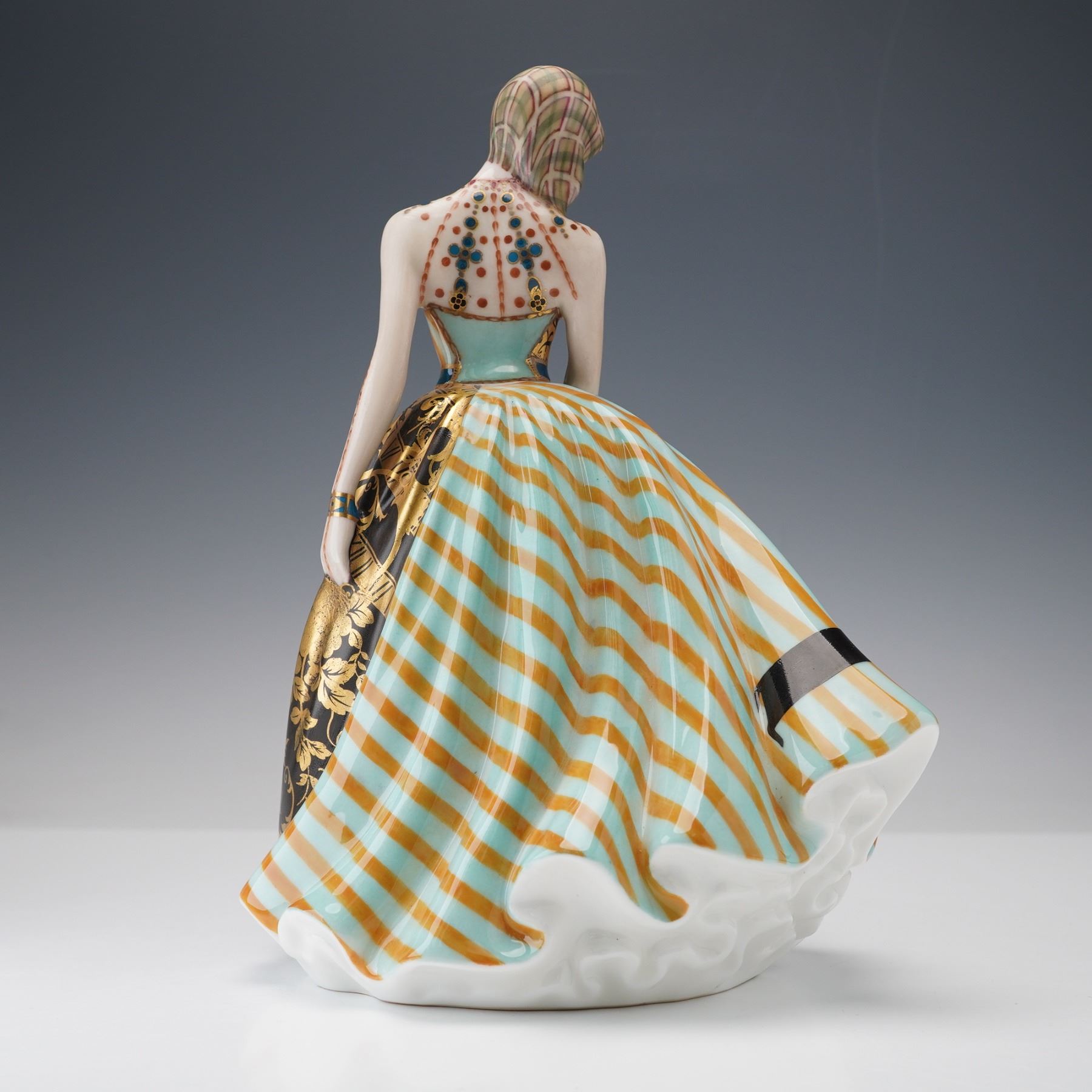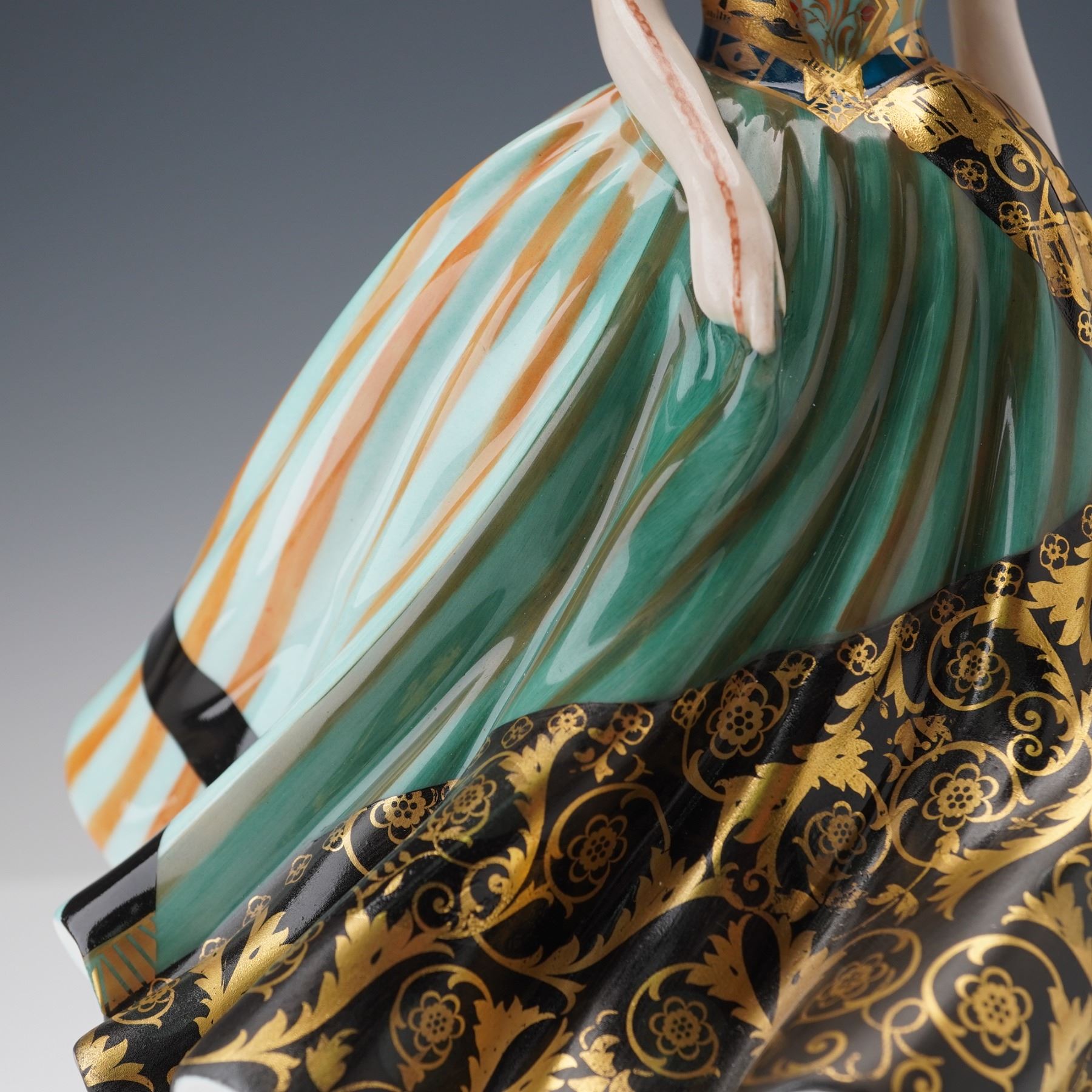This stunning Royal Doulton prototype figurine features an elegant lady dressed in a beautifully detailed gown with a striking green and gold theme. The dress is adorned with alternating mint green and gold stripes, complemented by intricate floral detailing in black and gold at the hem. The delicate hand-painted accents and raised enamel patterns enhance the gown's sophisticated design. The lady's serene expression and graceful posture elevate the timeless elegance of this figurine. Marked with the Royal Doulton backstamp on the base along with THIS ITEM IS THE PROPERTY OF ROYAL DOULTON (UK) LTD AND TITLE TO THE PROPERTY REMAINS WITH THE COMPANY AT ALL TIMES.