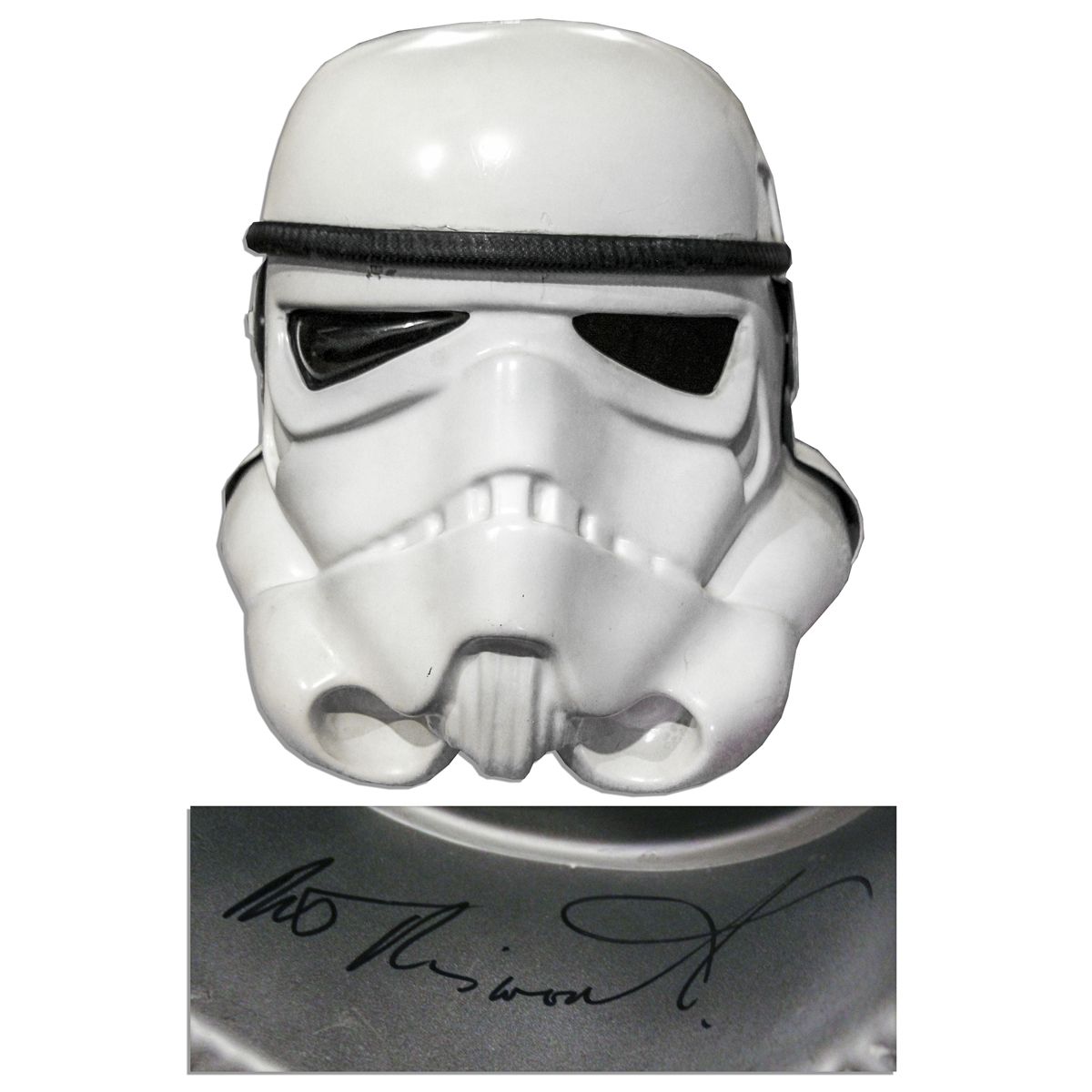 Helmet from ''Star Wars: A New Hope'' in 1977, signed by its designer. Unfinished Imperial Stormtrooper helmet is one of approximately six prototypes made of a specialized vacu-formed plastic. Features black rubber details, simulated vents and one clear plastic ''bubble'' eyepiece. Helmet by Andrew Ainsworth, who signs the inside in black felt tip, was crafted at Ainsworth's Shepperton Design Studios in early 1976, while other portions of George Lucas' epic film were shot at Pinewood Studios. White helmet features a ribbed edge at the back, a design element that was ultimately omitted due to its difficulty to produce. Measures 12'' in height and 12'' in diameter. Light fingerprint smudges, occasional abrasions to finish and minor cracking to right temple and jaw area. Accompanied by a black and white photograph of a stack of Stormtrooper helmets at Shepperton Design Studio and an LOA by Ainsworth. Originally lot 217 in the Film and Entertainment auction by Christie's, held in South Kensington on 17 December 2002.
