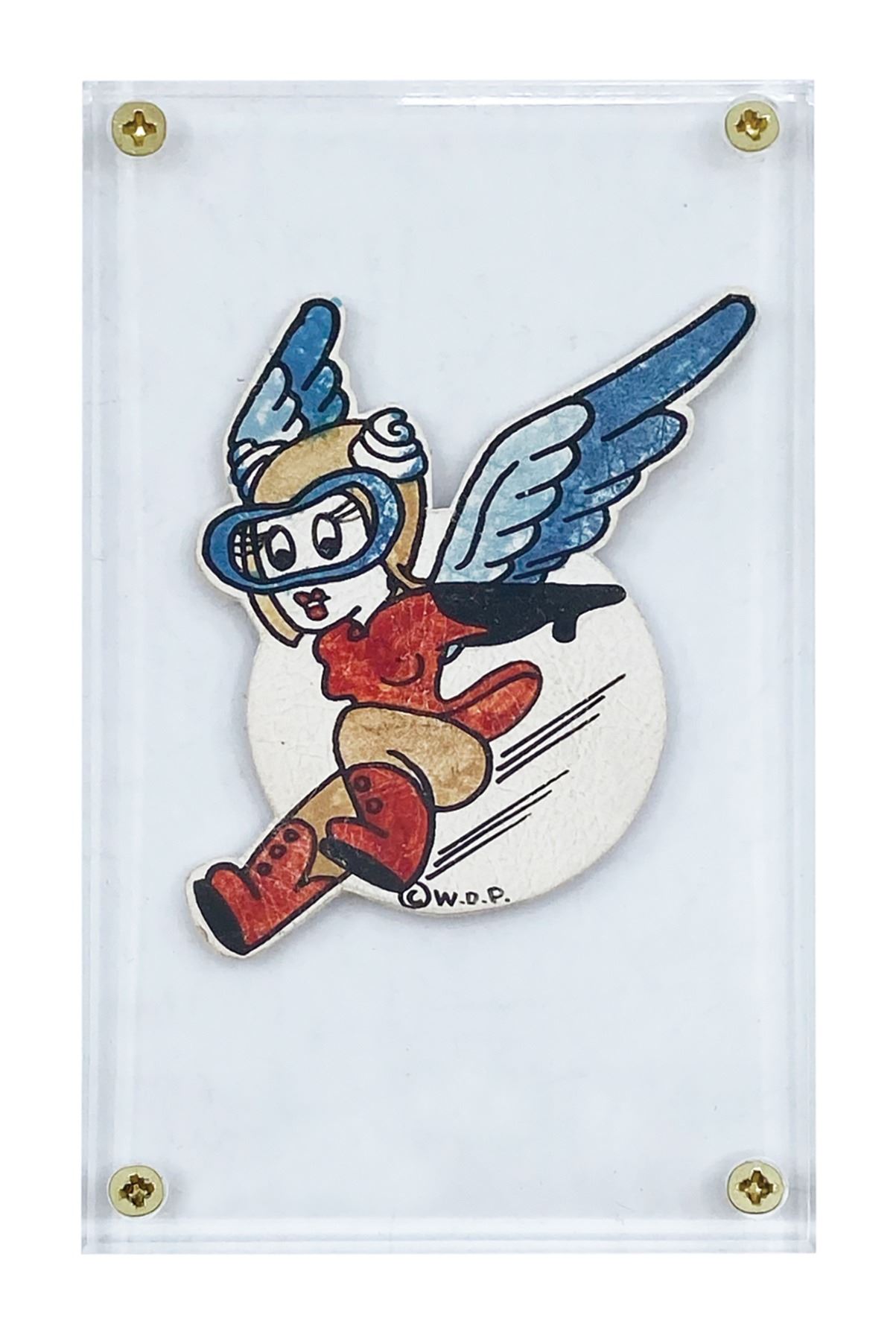 (Disney, 1940s) An original hand-illustrated prototype Fifinella unit insignia for the Women Airforce Service Pilots. Fifinella was designed by Walt Disney for a proposed film based on Roald Dahl's book "The Gremlins" and the WASP requested that Disney use the character as their official mascot. The illustration is accomplished in ink and gouche with handwritten copyright "WDP" on the Fifinella-shaped white leather. Measuring 3"x2.5", the unit insignia is in fine condition with only minor wear.