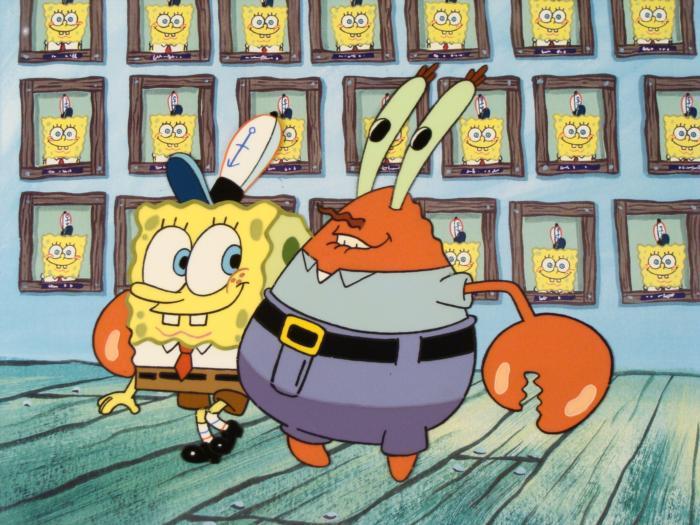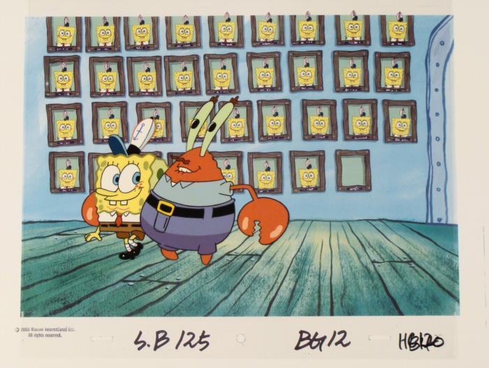 This animation cel and reproduction background are from the Nickelodeon TV show SpongeBob Squarepants. The story takes place under the deep blue sea in Bikini Bottom, where SpongeBob resides. SpongeBob, who is a yellow, porous sponge, is your typical happy-go-lucky character, as he is always cheerful and enjoys making people laugh. Patrick Star, SpongeBob's neighbor who is a starfish, is your average children's show idiot, as he boasts knowing nothing and is often getting himself into ridiculous situations. Between the homes of these two lies the home of the miserable Squidward, a squid, who is known for being grouchy and playing tricks on SpongeBob and Patrick. Both SpongeBob and Squidward work at the Krusty Krab, a fast food business run by the greedy money-loving Mr. Krabs, a crab, the arch rival of the evil, possibly misunderstood, Plankton. Another neighbor, Sandy Cheeks, an athletic squirrel who normally wears an astronaut's space suit, was introduced in "Tea at the Treedome." She spends most of her time inventing and experimenting. Mr. Krabs is proud of SpongeBob's hard workOriginal Printed Background and Animated Cel Overall Size of Background: 10 1/2" x 17" Overall Size of the Cels: 10 1/2" x 12 1/2" Very good conditionThis is an original hand-painted cel set-up used in the production of an episode of "SpongeBob SquarePants." Each one-of-a-kind set-up represents a slight change in position of the characters. When individually photographed and projected in rapid succession, the images appear to move.