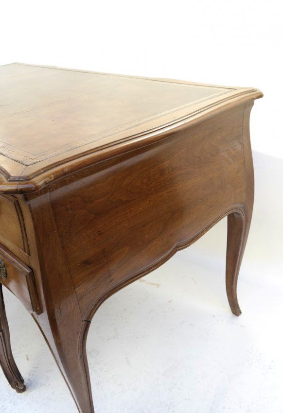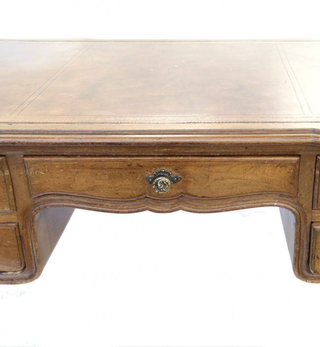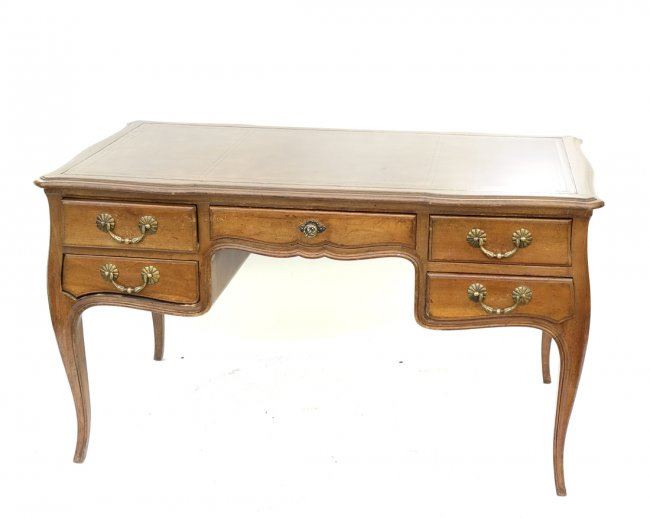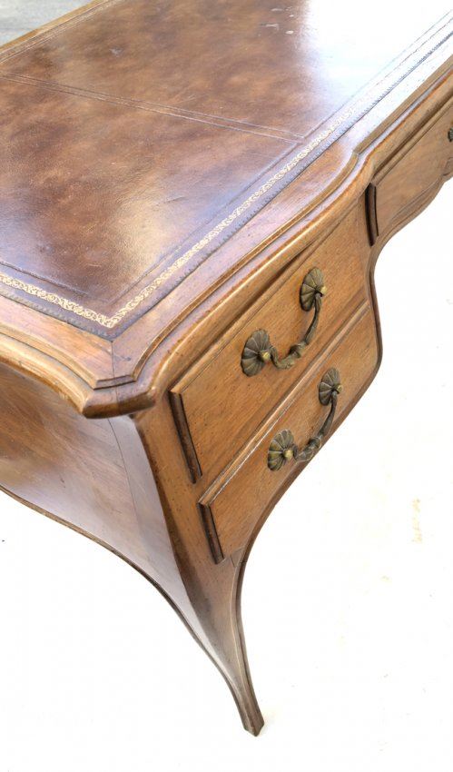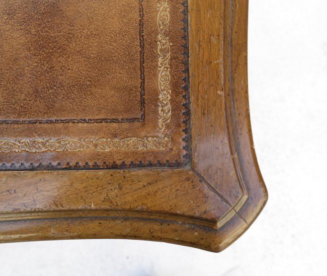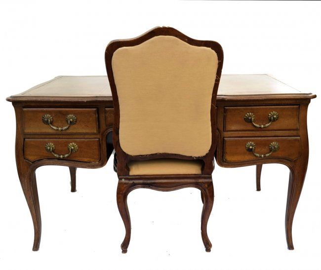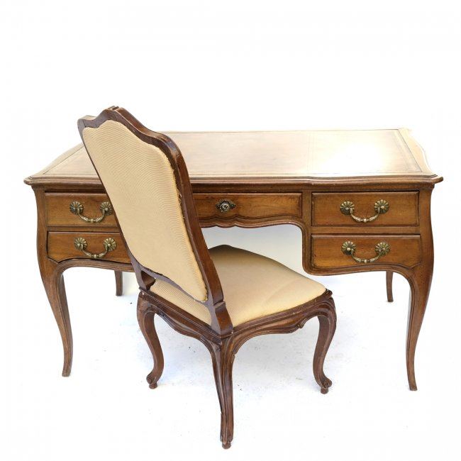 Tooled leather top desk, in the manner Auffray, and a complimentary side chair. [Chair: 52" W x 27" D x 30 1/4" H; Desk 24" to opening]. In overall good condition.