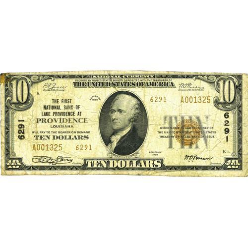 <B>Providence, LA</B></I> - $10 1929 Ty. 2 <B>The First NB of Lake Providence</B></I> Ch. # 6291<BR>A just plain tough bank which was this community's only issuer. A very slightly better example from here realized $1035 in a 2004 auction. <B>About Fine,</B></I> with a small rust spot at the top left corner.