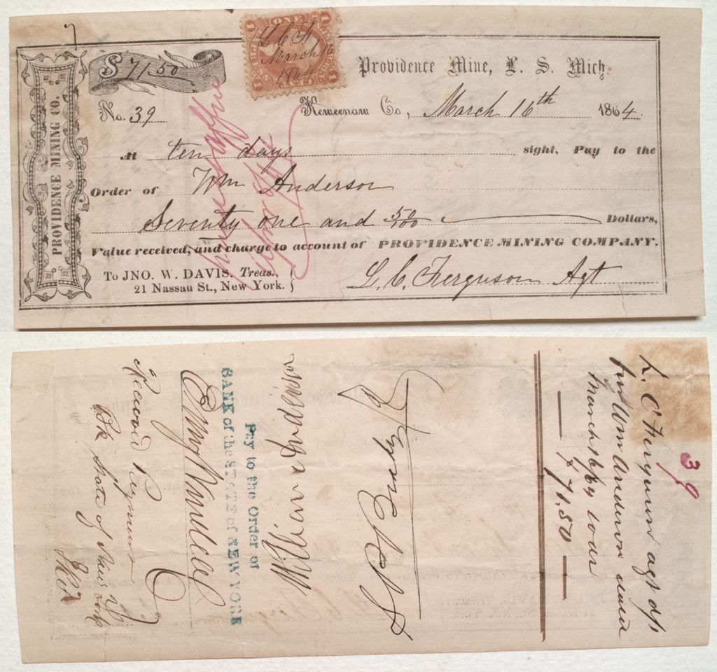 1864 Providence Mining Co. Check. Check #39 to William Anderson for $71.50. Signed by L. C. Ferguson, agent. Has 1c brown express stamp.City: [/b]ProvidenceCounty: Lake SuperiorState: MI