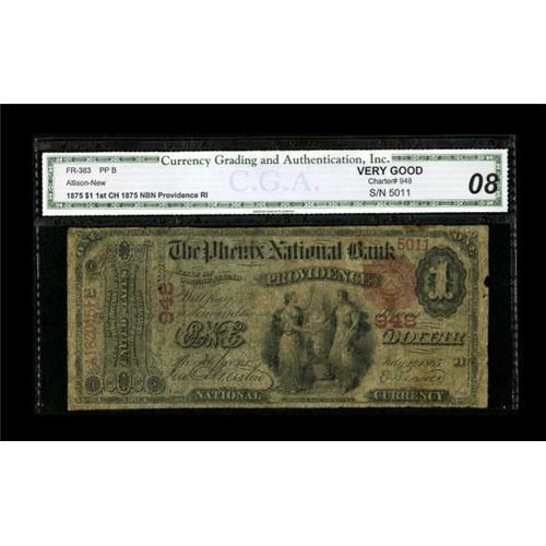 <B>Providence, RI</B></I> - $1 1875 Fr. 383 <B>The Phenix NB</B></I> Ch. # 948<BR> A well circulated <B>CGA Very Good 08</B></I> with a scattering of pinholes that is otherwise fully intact but for a tiny margin nick in the right margin.<BR><BR><b>Shipping:</b> Coins & Currency (<a target="_blank" href="http://www.heritageauctions.com/common/shipping.php">view shipping information</a>)
