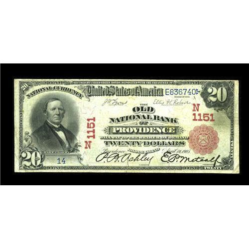 <B>Providence, RI</B></I> - $20 1902 Red Seal Fr. 639 <B>The Old NB</B></I> Ch. # (N)1151<BR>Boldly engraved signatures of P.B. Ashley and E.P Metcalf add to the eye appeal of this Red Seal. Only two examples of this type are known from this banking institution which is explained by the bank's liquidation in 1906. The note is fully detailed with boldly remaining colors. There are a few pinholes noted at center, but are mostly lost in the design. <B>Very Good-Fine.</B></I><BR><BR><b>Shipping:</b> Coin/Currency (<a target="_blank" href="http://www.heritageauctions.com/common/shipping.php">view shipping information</a>)