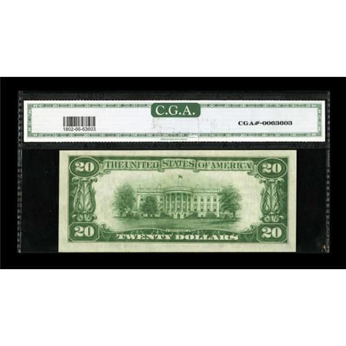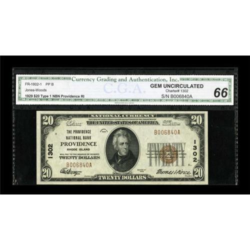 <B>Providence, RI</B></I> - $20 1929 Ty. 1 <B>The Providence NB</B></I> Ch. # 1302<BR> Fresh, fully original, and about as nice as any note from here could be. <B>CGA Gem Uncirculated 66</B></I>.<BR><BR><b>Shipping:</b> Coins & Currency (<a target="_blank" href="http://www.heritageauctions.com/common/shipping.php">view shipping information</a>)