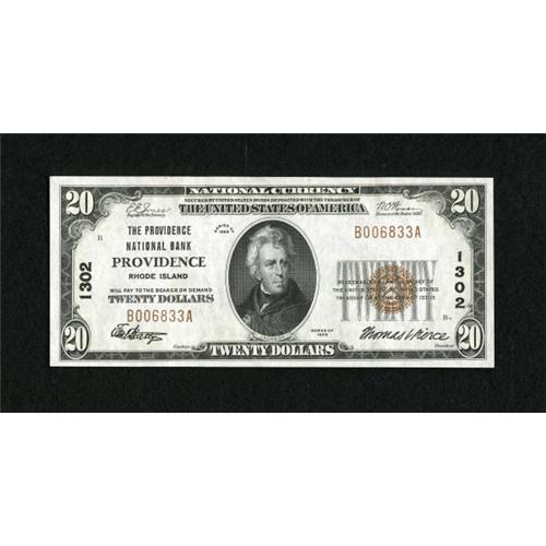<B>Providence, RI</B></I> - $20 1929 Ty. 1 <B>The Providence NB</B></I> Ch. # 1302<BR> A pleasing <B>Choice Crisp Uncirculated</B></I> capital city note that has a slight corner bump at left.<B> </B></I><BR><BR><b>Shipping:</b> Coins & Currency (<a target="_blank" href="http://www.heritageauctions.com/common/shipping.php">view shipping information</a>)