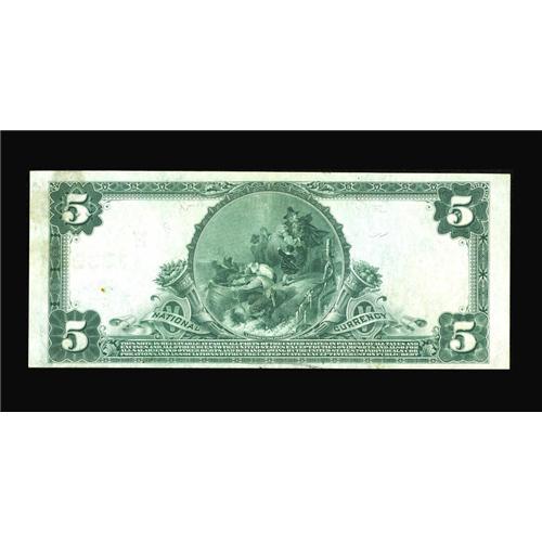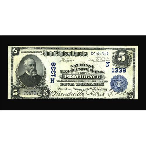 <B>Providence, RI</B></I> - $5 1902 Plain Back Fr. 598 <B>The National Exchange Bank</B></I> Ch. # (N)1339<BR>"United States of America" at top center and the charter numbers produced easily viewed embossing on this $5. The handling of this note consists of a little bit of counting soil, a center fold, and a tiny brown spot on the back. The bottom edge is also inside the frame line. <B>About Uncirculated.</B></I><BR><BR><b>Shipping:</b> Coins & Currency (<a target="_blank" href="http://www.heritageauctions.com/common/shipping.php">view shipping information</a>)