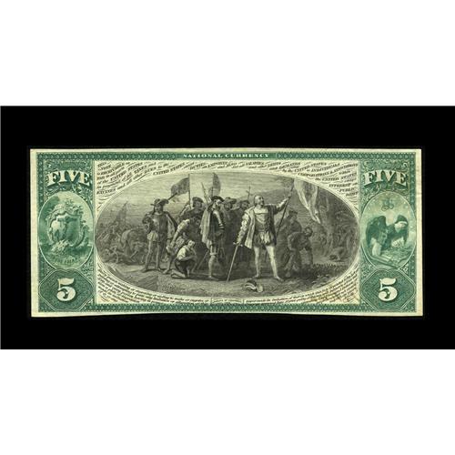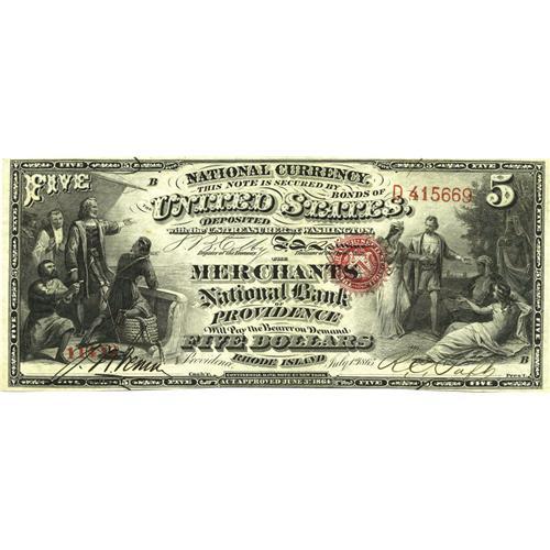 <B>Providence, RI</B></I> - $5 Original Fr. 397 <B>The Merchants NB</B></I> Ch. # 1131<BR>A beautiful First Charter example with an impressive pedigree, having been obtained by our consignor in a 1991 Stack's sale after a lone prior appearance in a 1980 Hickman sale. Its been off the market for fifteen years, and, with its vivid colors and bold printing, is likely to again leave the market for an extended period after tonight's offering. <B>Choice Crisp Uncirculated,</B></I> a gem save for the tight bottom margin which just touches the design at the center of the note.