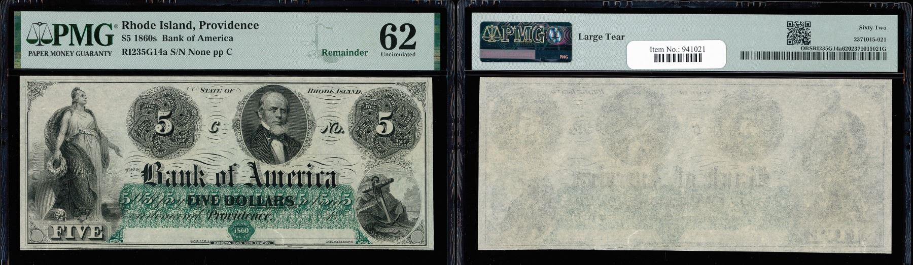 Providence, Rhode Island - Bank of America $5 18__ G14a Remainder PMG Uncirculated 62 (Haxby-G14a),